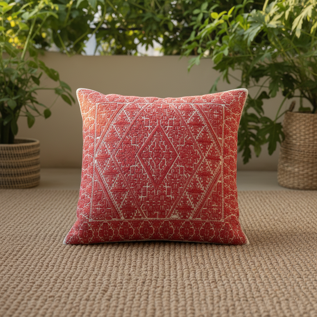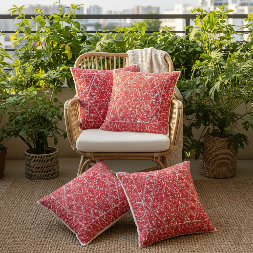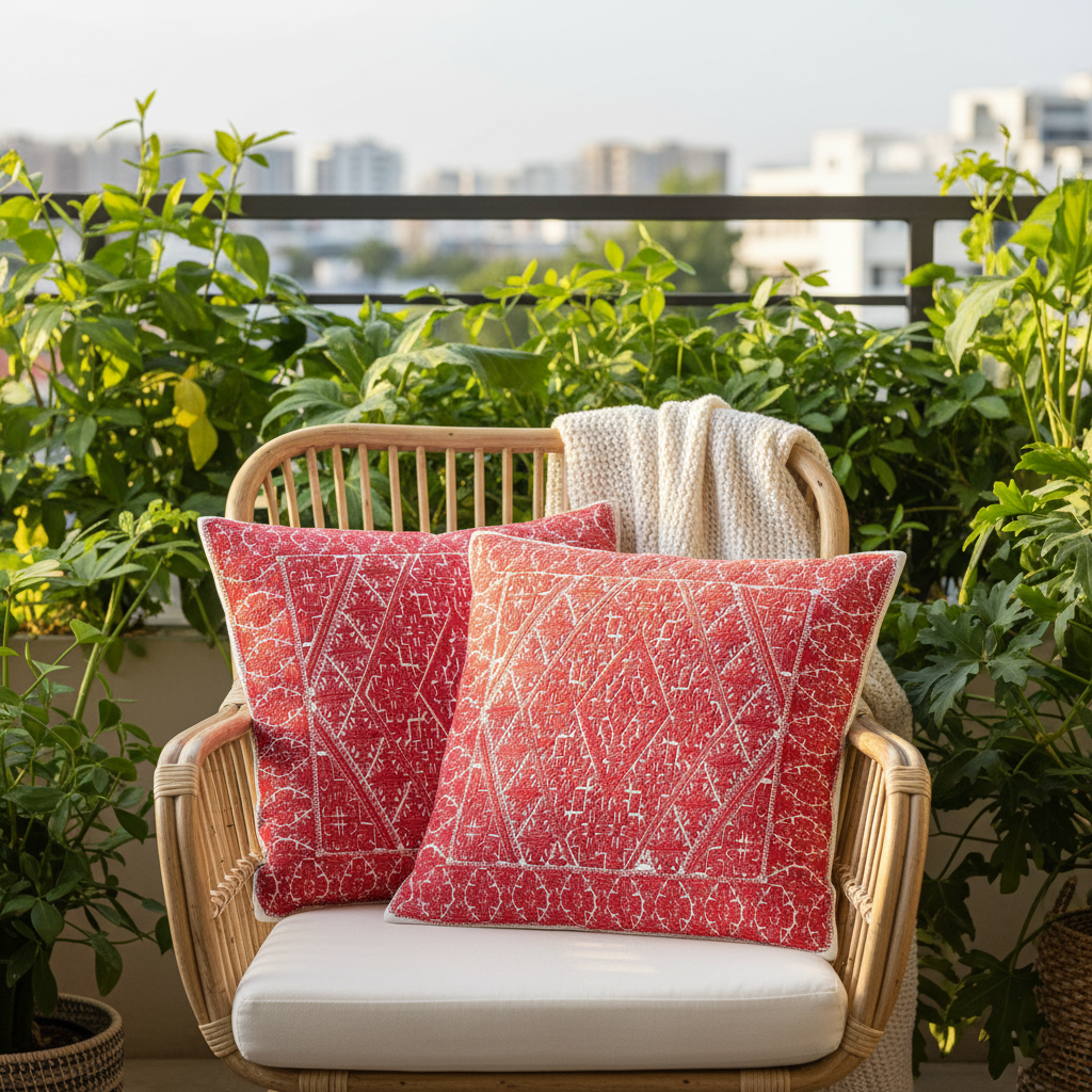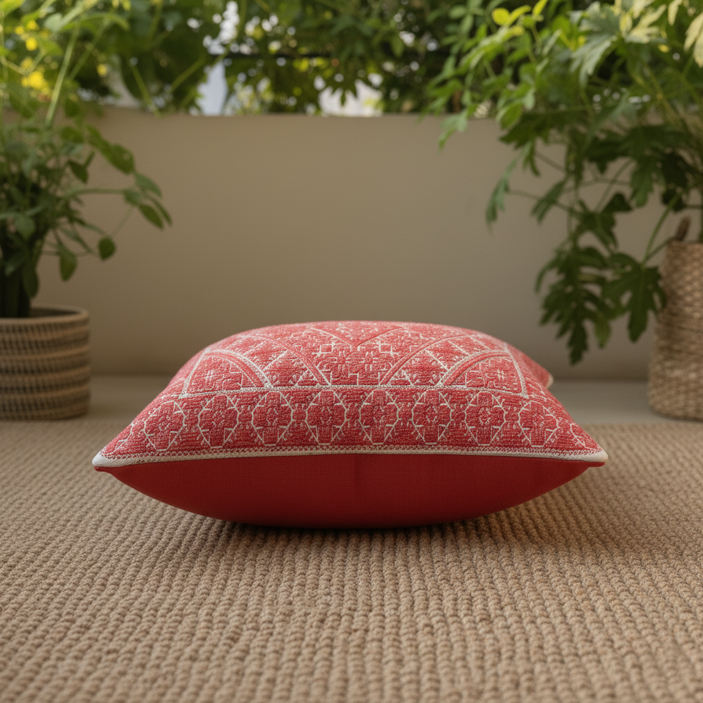 Celebrate this Diwali with elegance and tradition using the Ruhani Handcrafted Chambray Cushion Cover. Made from 100% soft chambray cotton, it showcases delicate embroidery in vibrant red and white hues — a perfect blend of luxury and Indian craftsmanship.