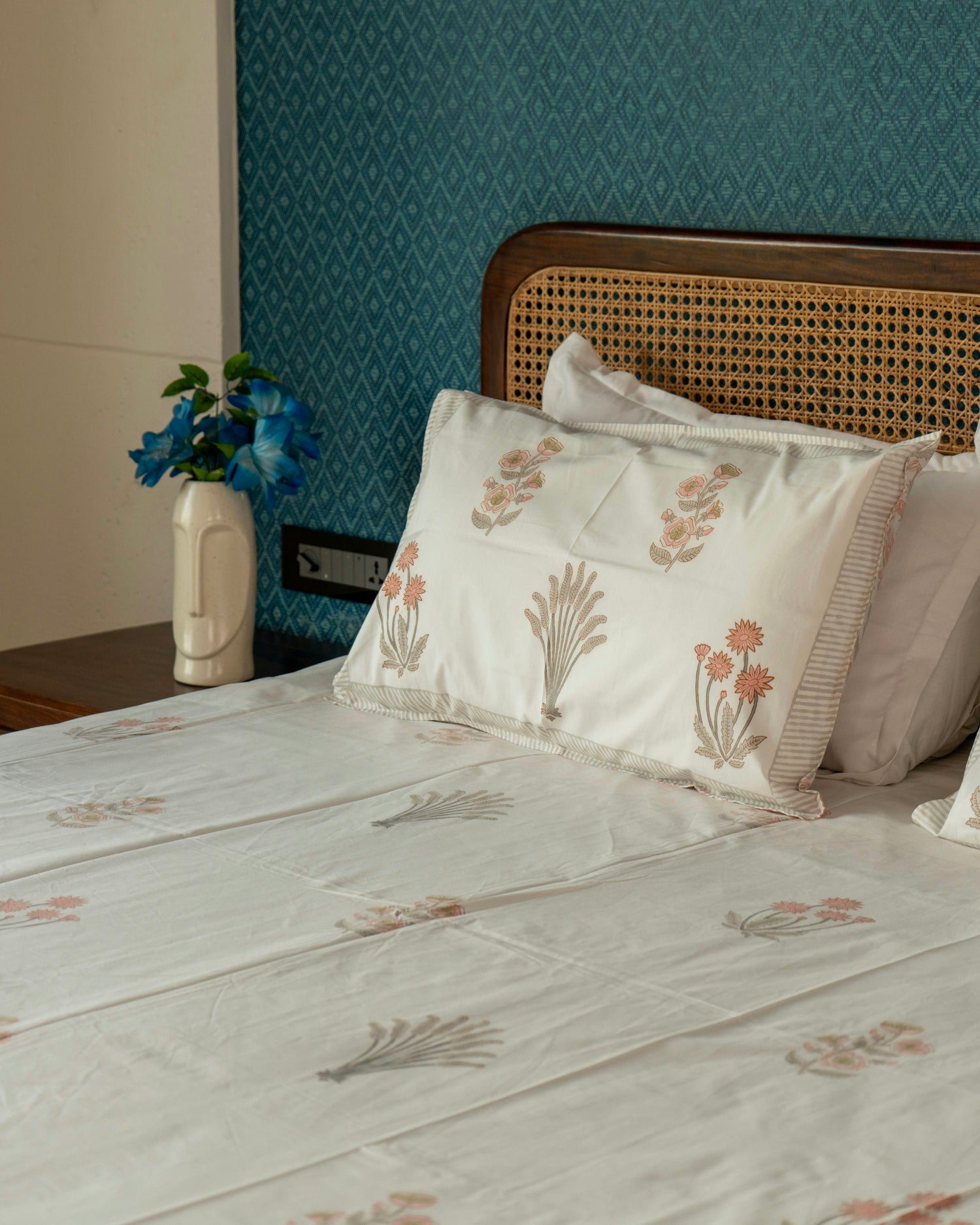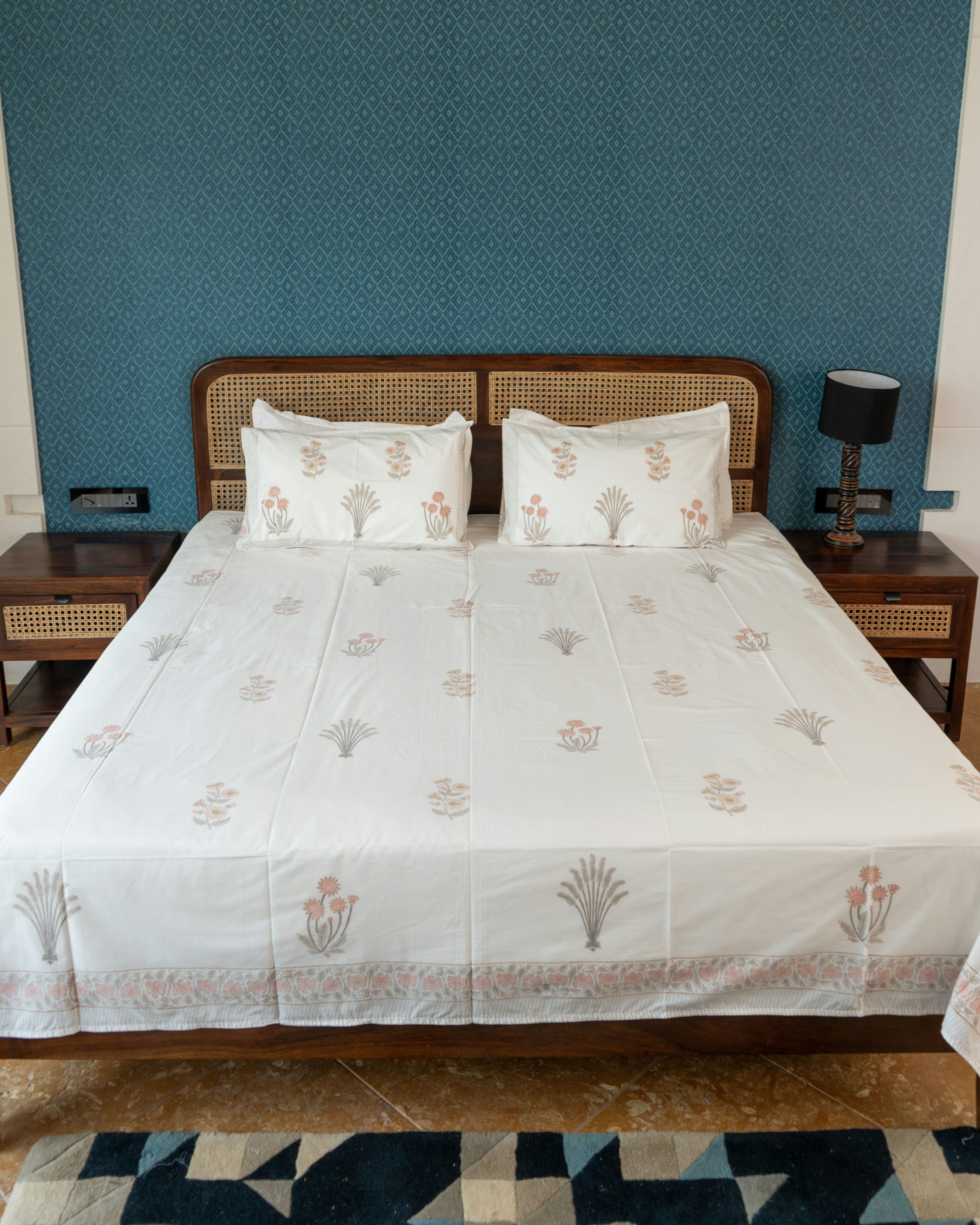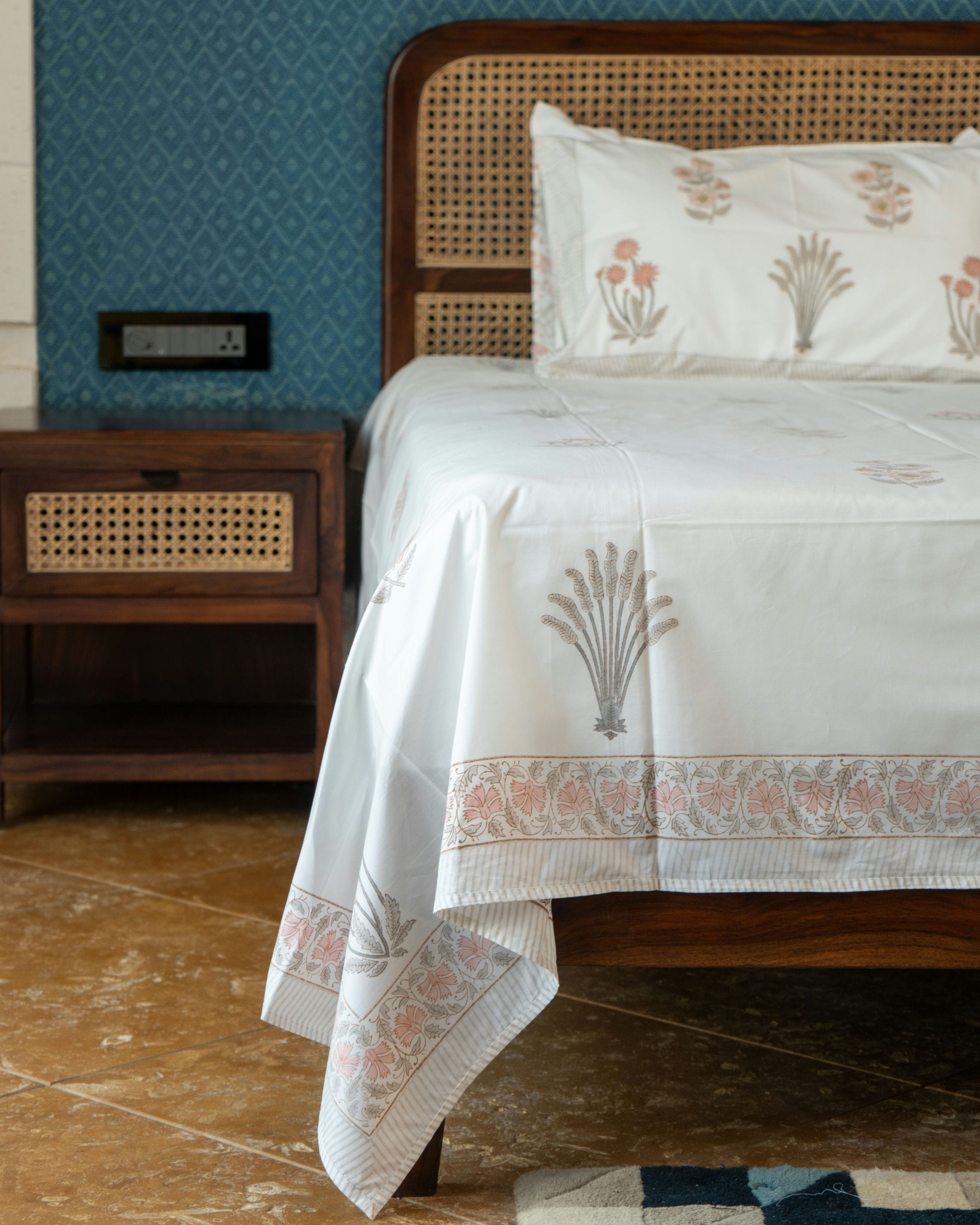 Illuminate your bedroom with the subtle grace of The Chandni Set. Named after the Hindi word for 'moonlight', this exquisite hand block printed bed sheet set features delicate floral and grassy motifs in a gentle, earthy palette of pale peach and soft gray. The soothing colors and intricate design create a tranquil and elegant atmosphere, much like a moonlit night in a garden.