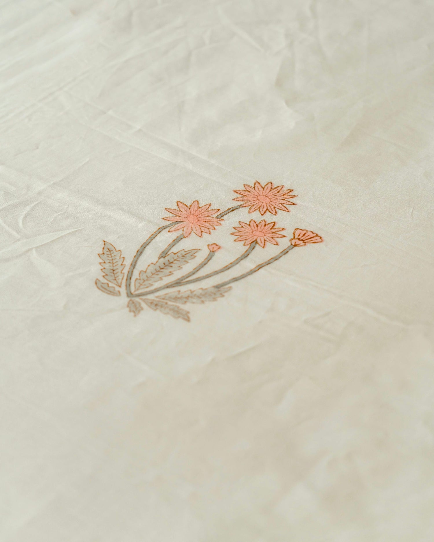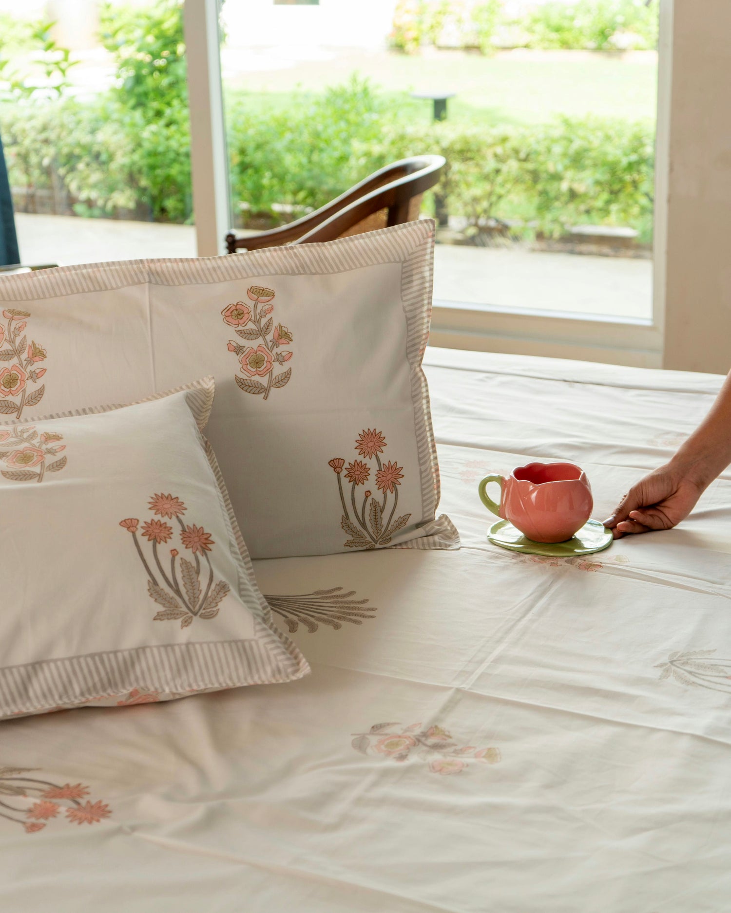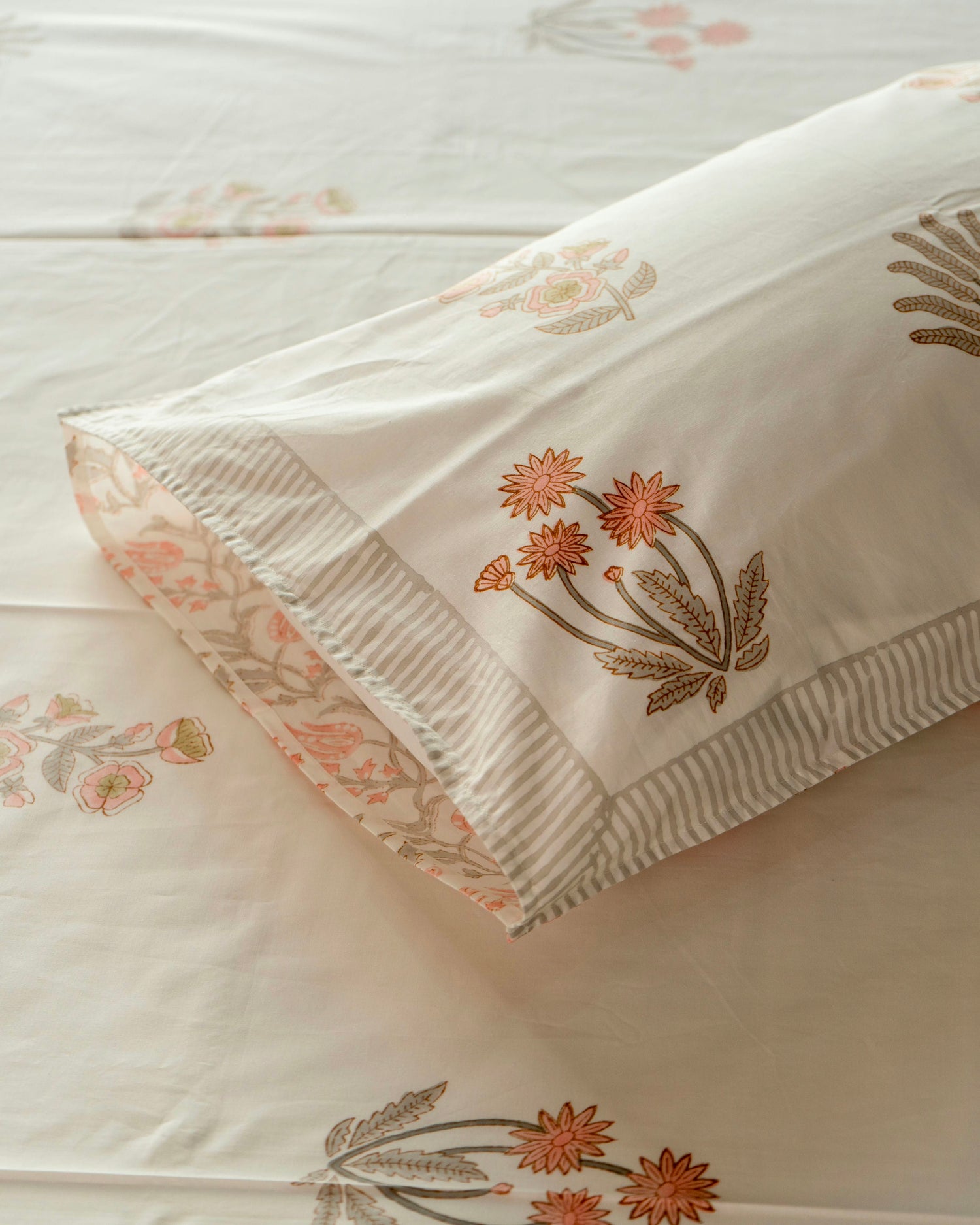 Illuminate your bedroom with the subtle grace of The Chandni Set. Named after the Hindi word for 'moonlight', this exquisite hand block printed bed sheet set features delicate floral and grassy motifs in a gentle, earthy palette of pale peach and soft gray. The soothing colors and intricate design create a tranquil and elegant atmosphere, much like a moonlit night in a garden.