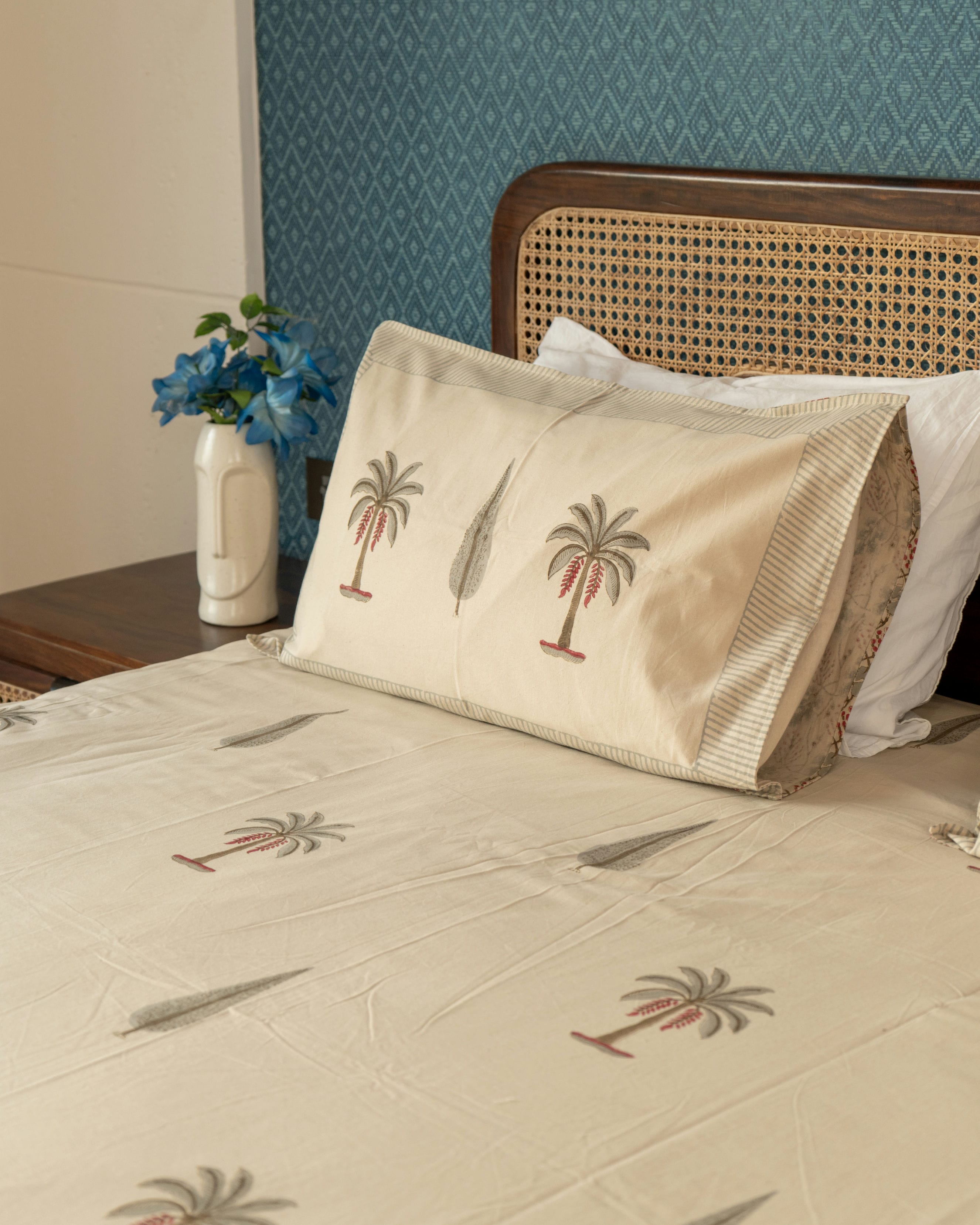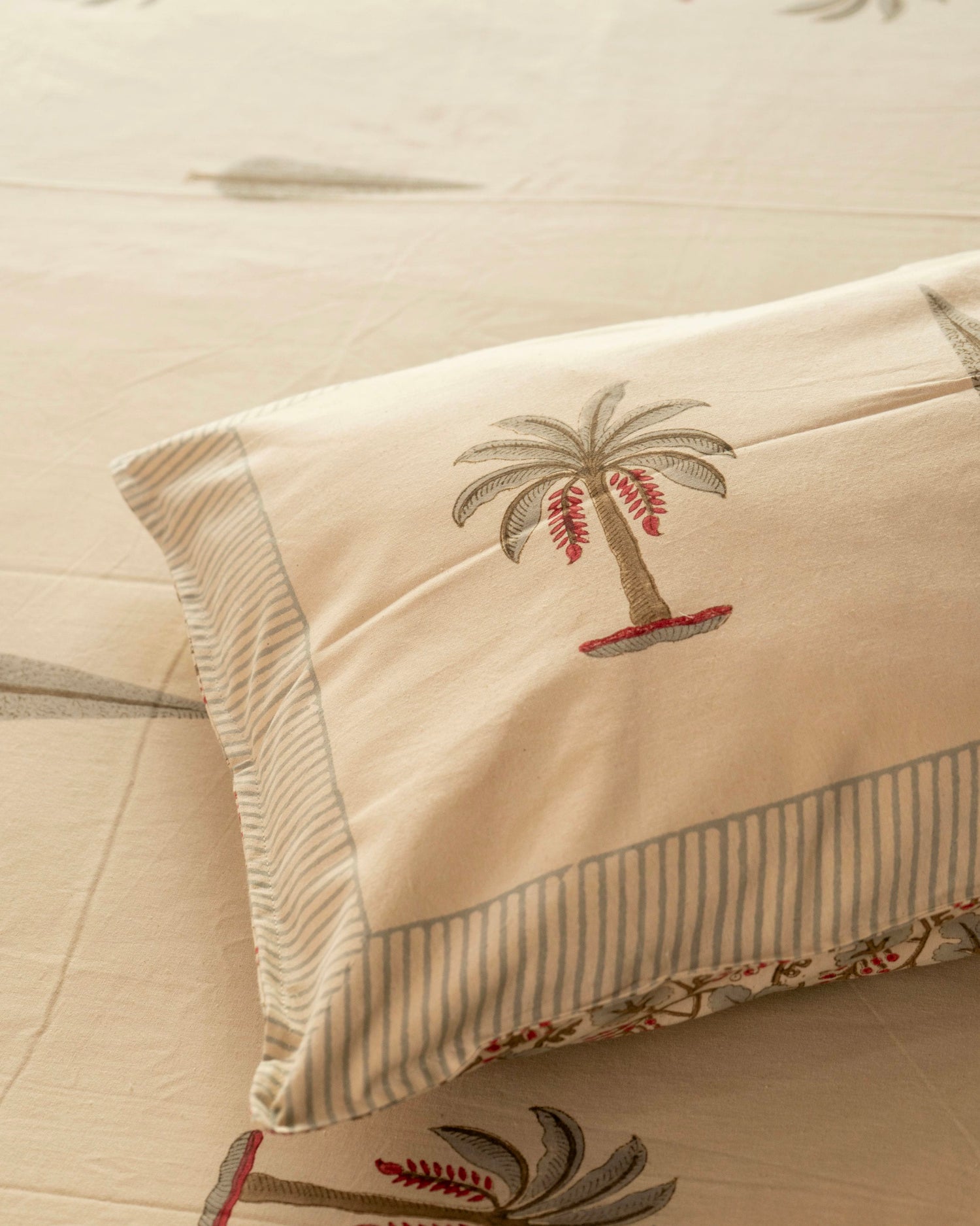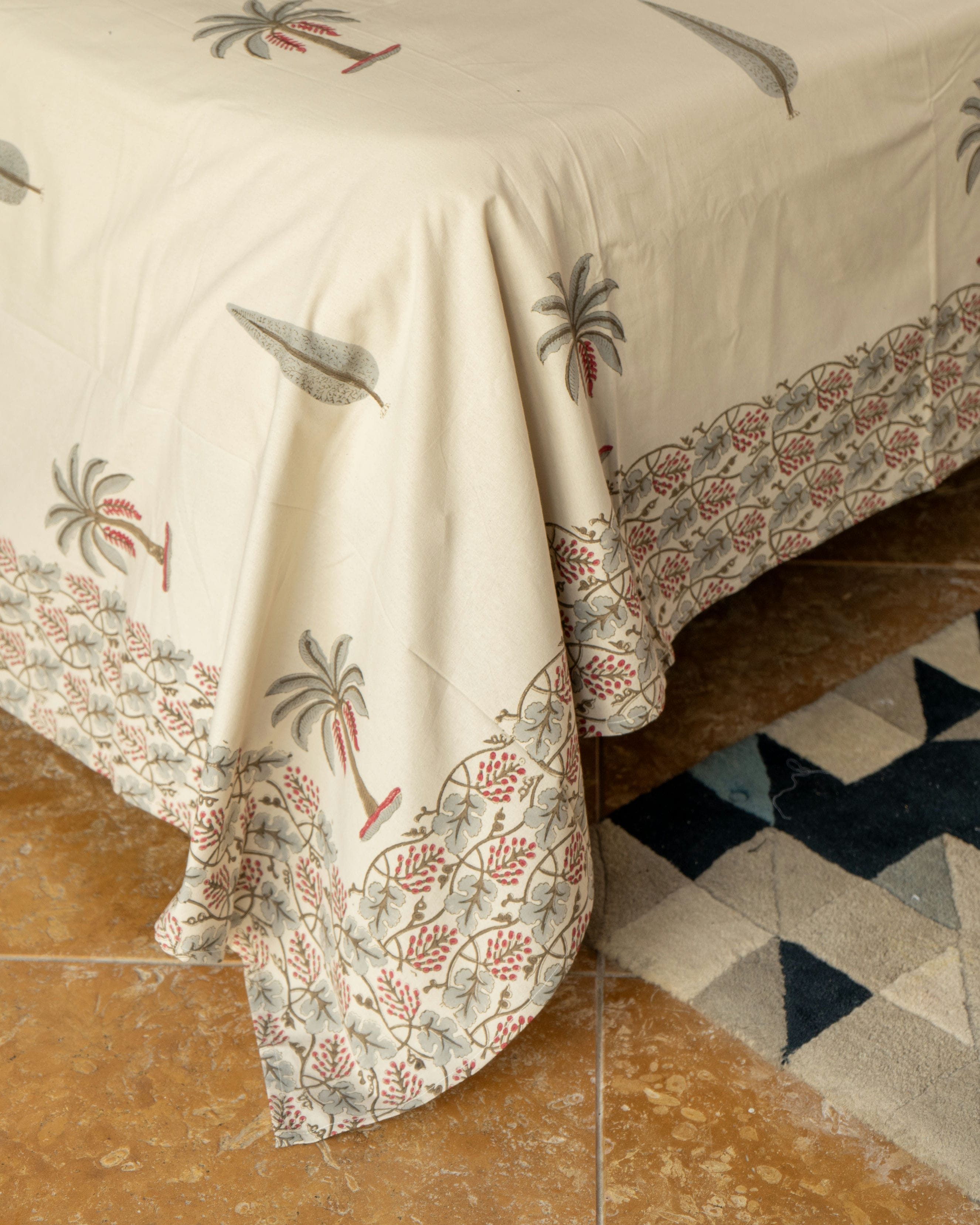 Capture the subtle, rugged elegance of the desert landscape with The Marusthal Set. Named after the Hindi word for 'desert' (referencing the arid beauty of Rajasthan), this hand block printed bed sheet set features striking palm tree and leaf motifs in a sophisticated, muted palette of beige, gray, and earthy maroon. The wide, intricately patterned border at the foot of the bed adds a traditional, anchoring element to the design.