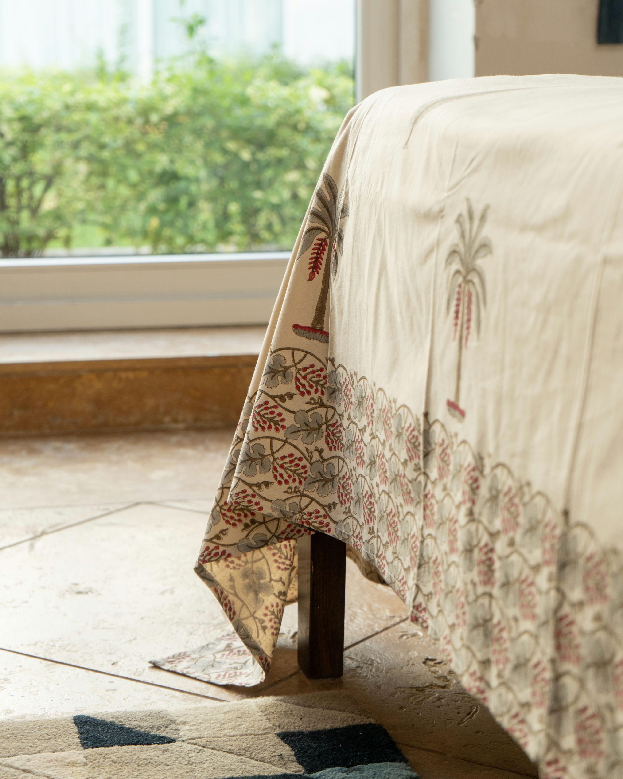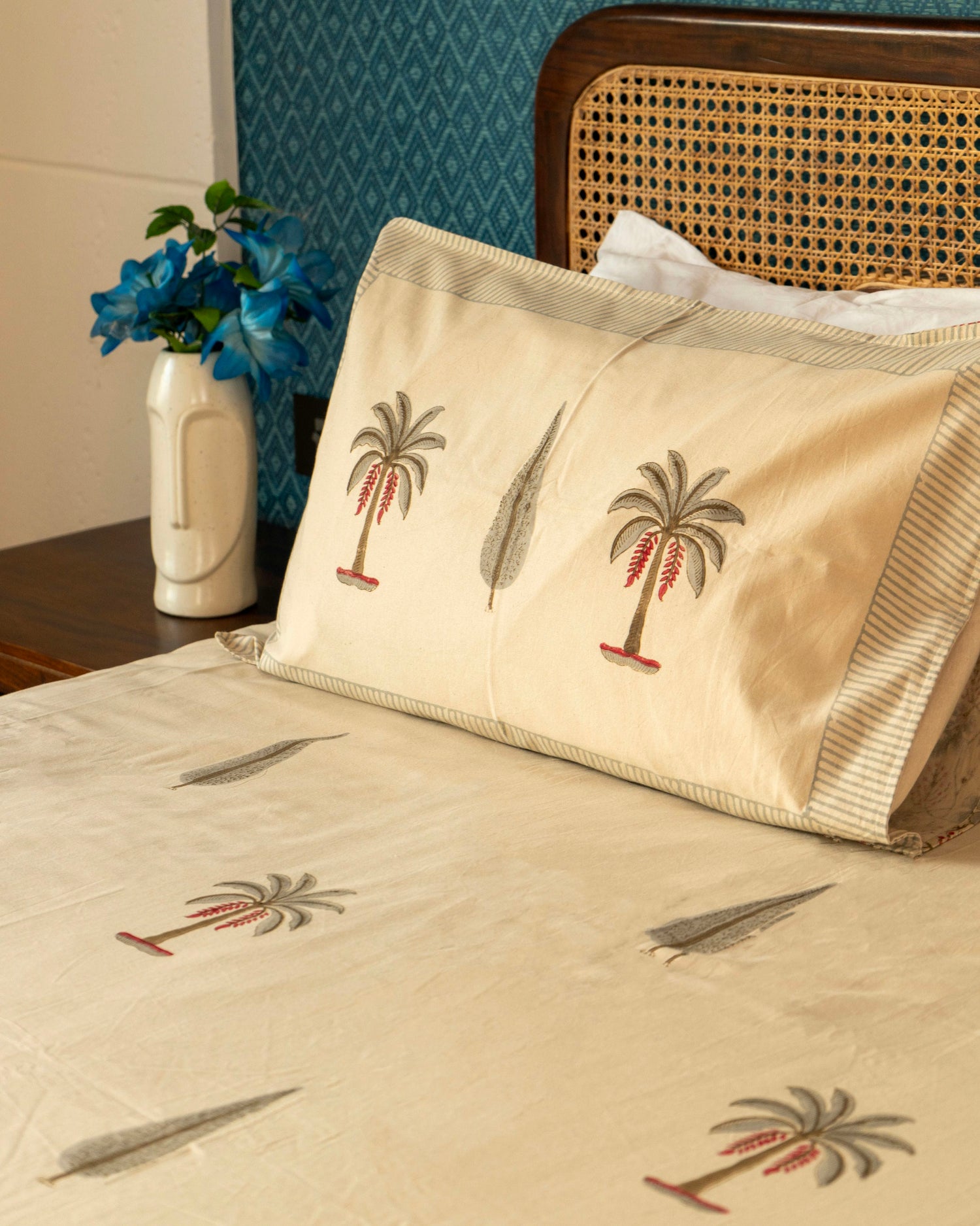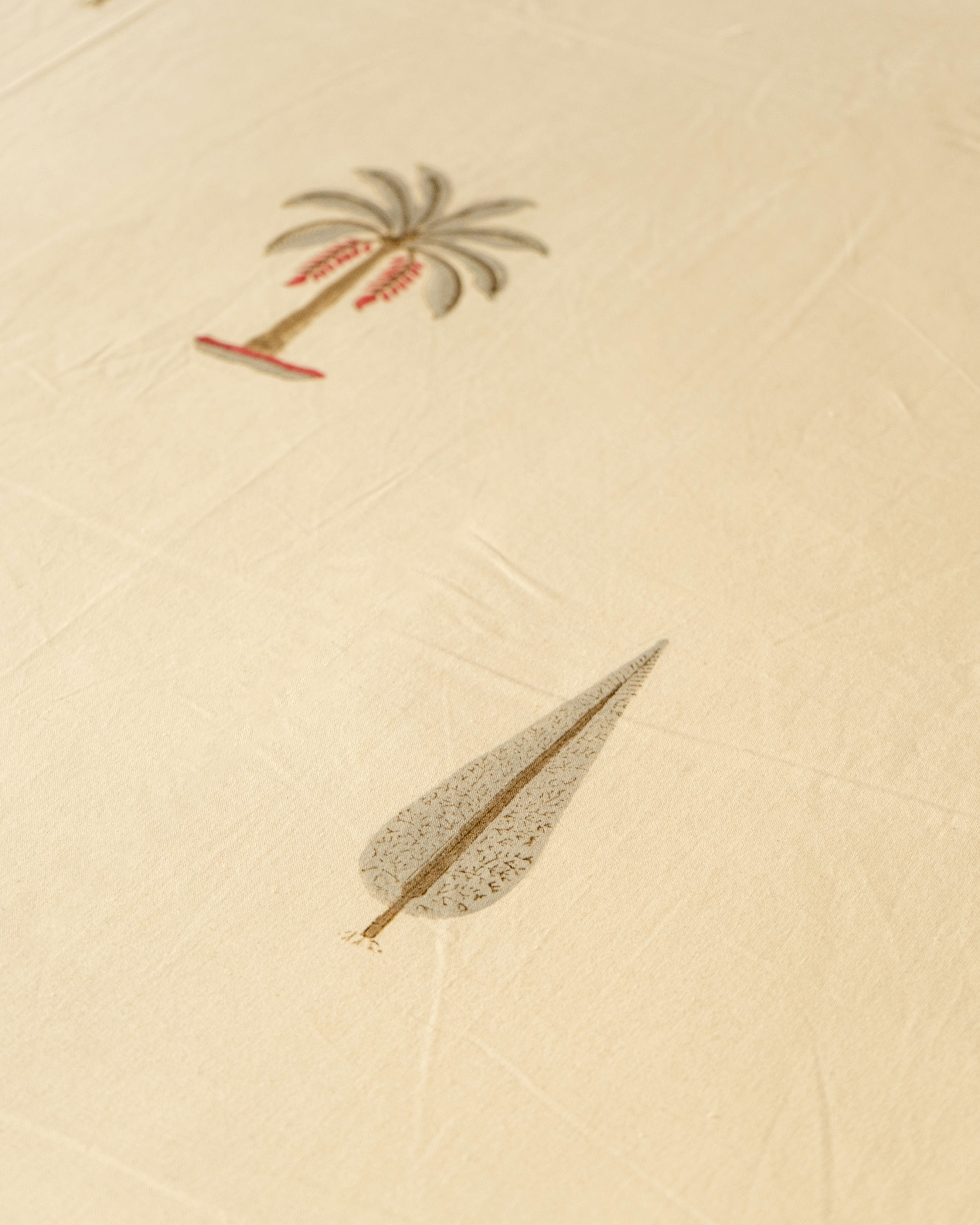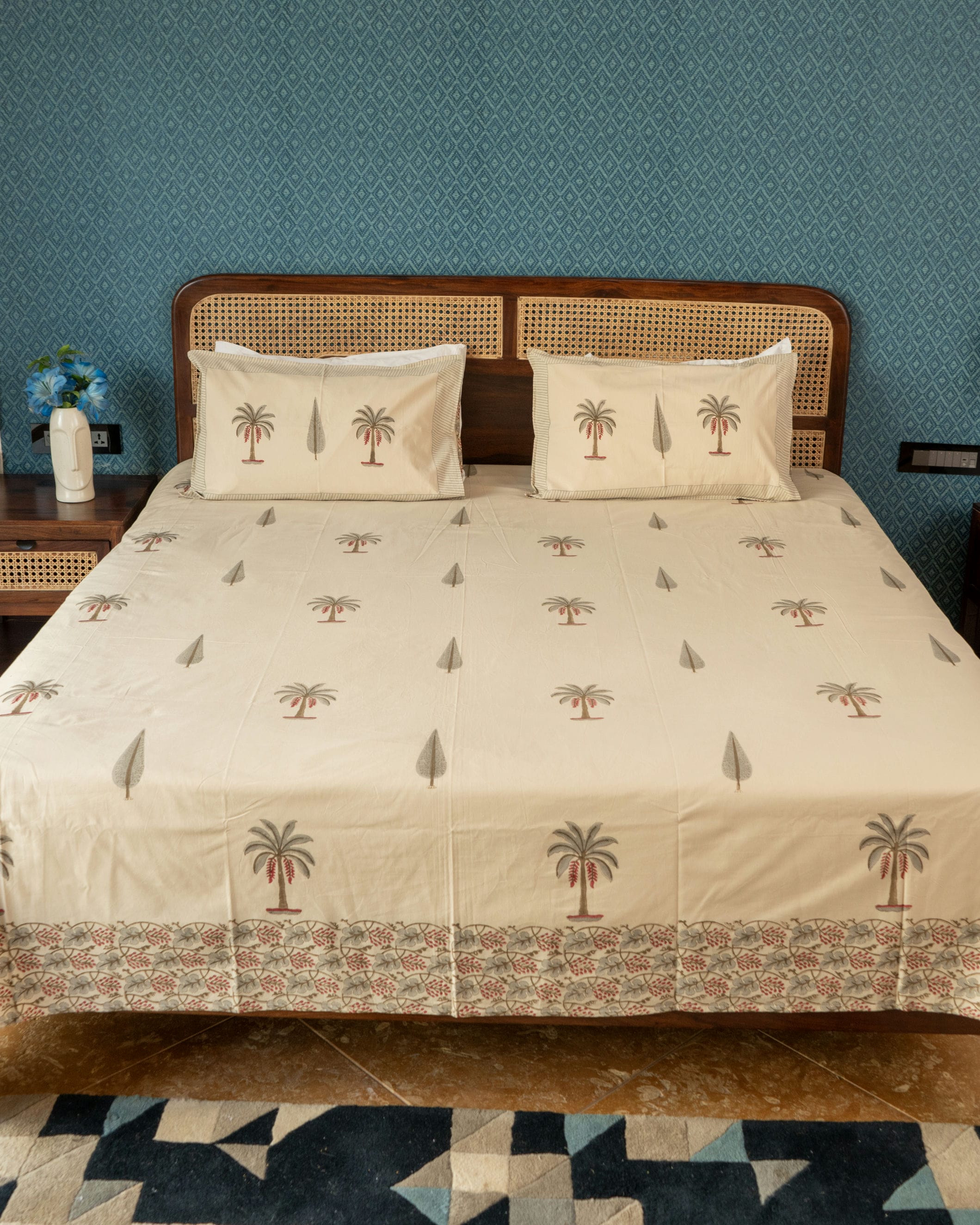 Capture the subtle, rugged elegance of the desert landscape with The Marusthal Set. Named after the Hindi word for 'desert' (referencing the arid beauty of Rajasthan), this hand block printed bed sheet set features striking palm tree and leaf motifs in a sophisticated, muted palette of beige, gray, and earthy maroon. The wide, intricately patterned border at the foot of the bed adds a traditional, anchoring element to the design.