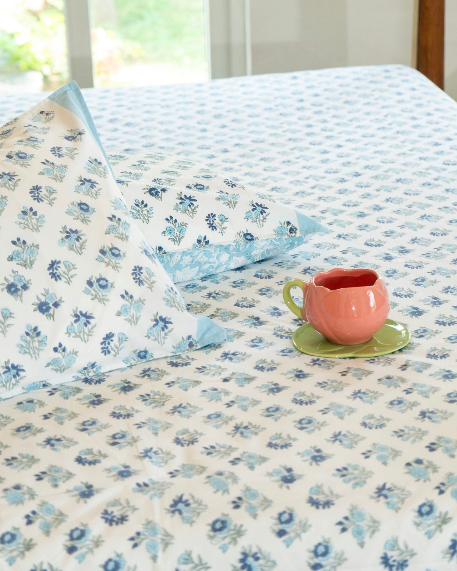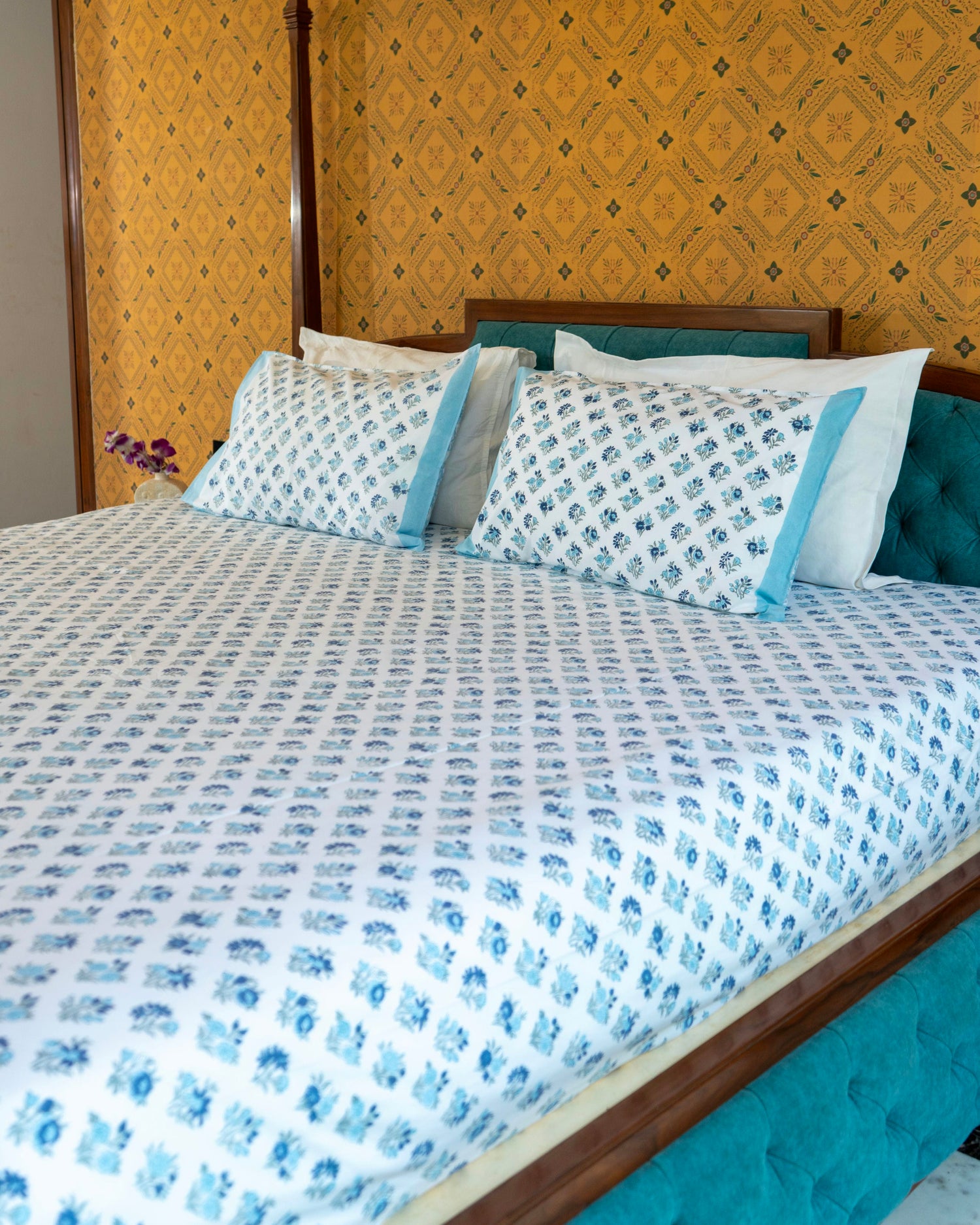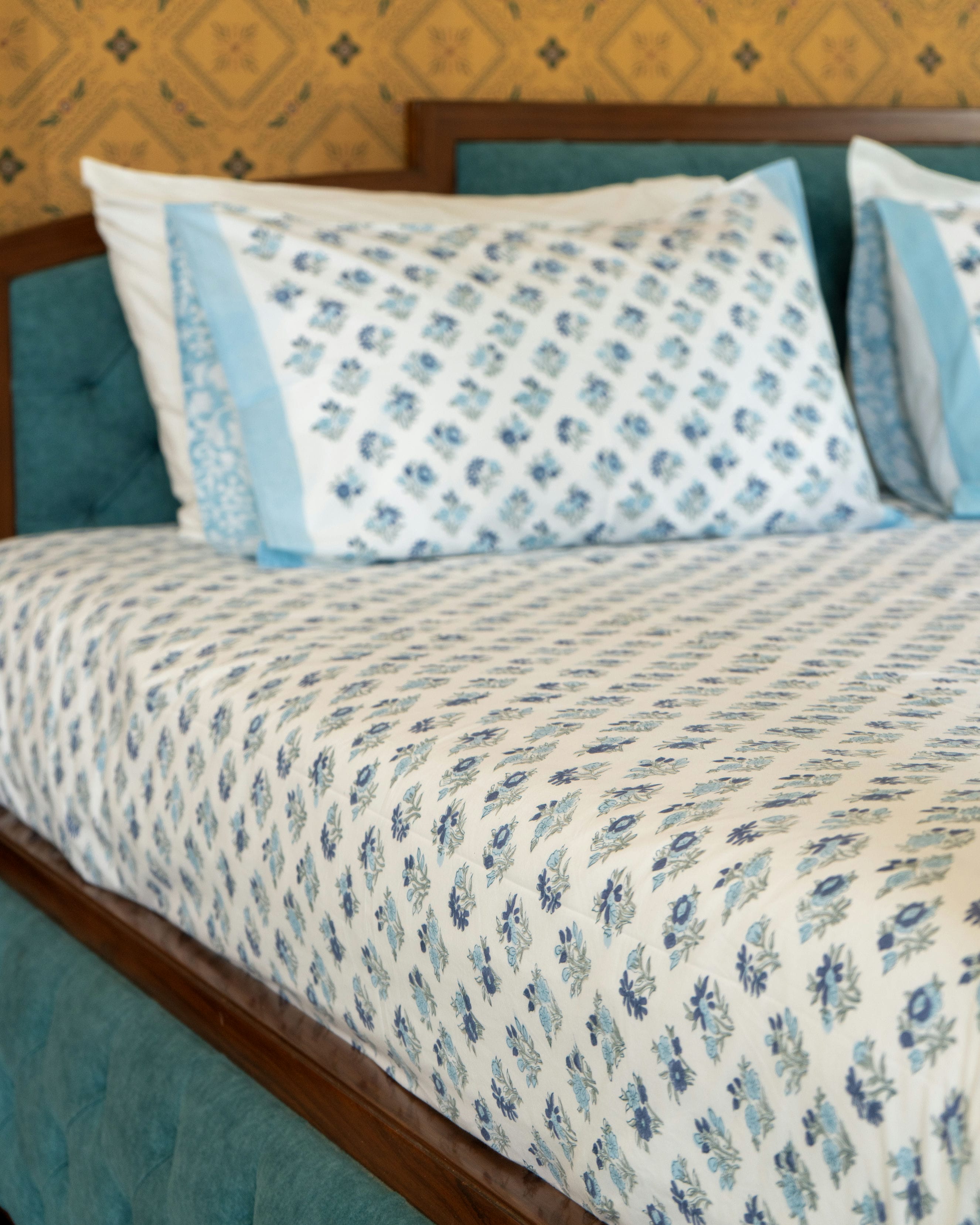 Celebrate the spirit of Diwali with The Mayura Blue, a hand block printed bed sheet set that’s a perfect blend of artistic craftsmanship and luxurious comfort. Inspired by the rich traditions of Jaipur, this set features intricate, hand-stamped floral patterns in soothing blue hues. The design evokes the elegance and beauty of a peacock’s plumage ('Mayura' in Sanskrit), adding a touch of serene sophistication to your bedroom.