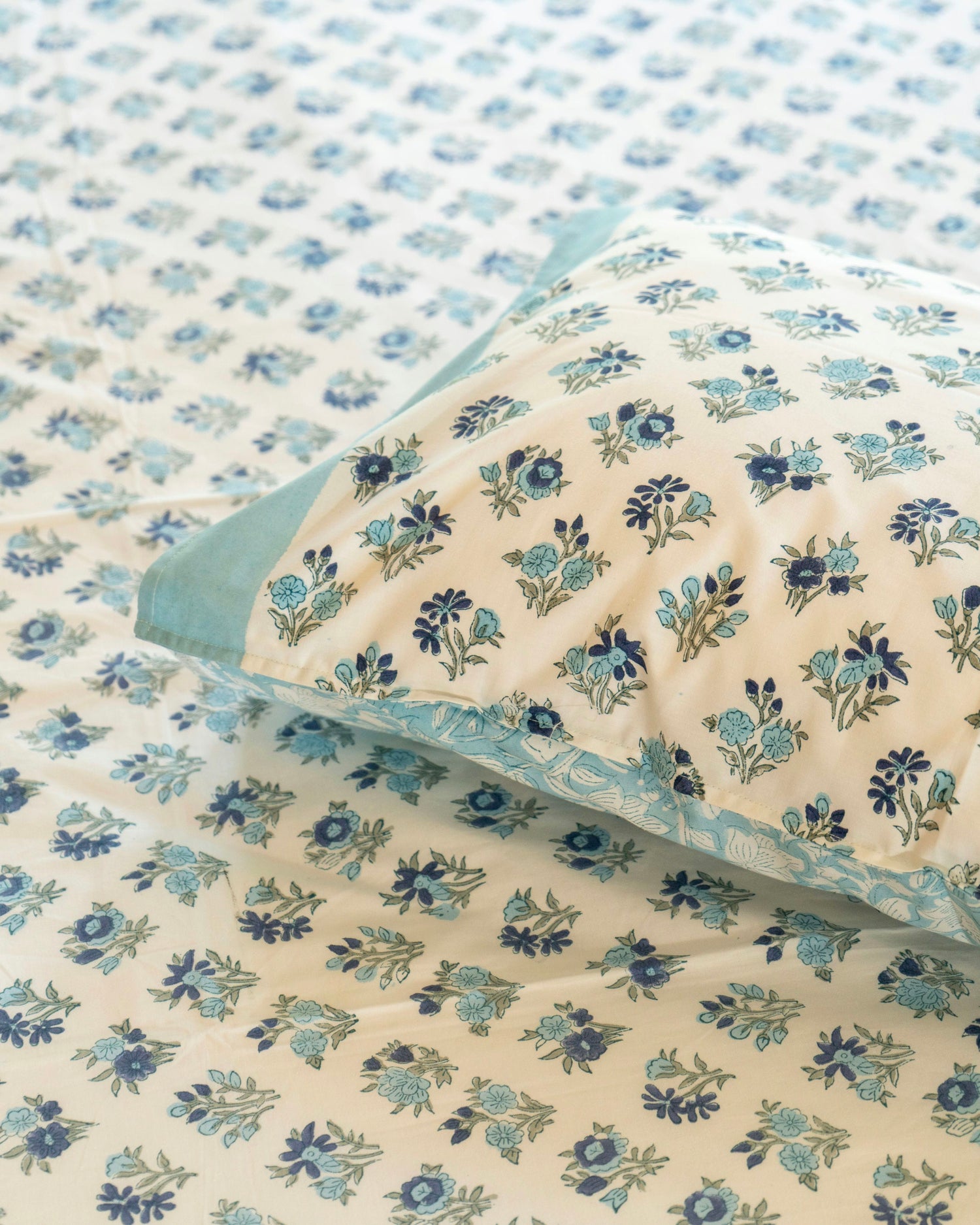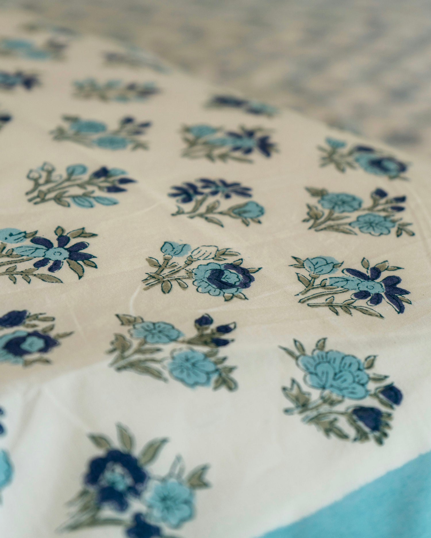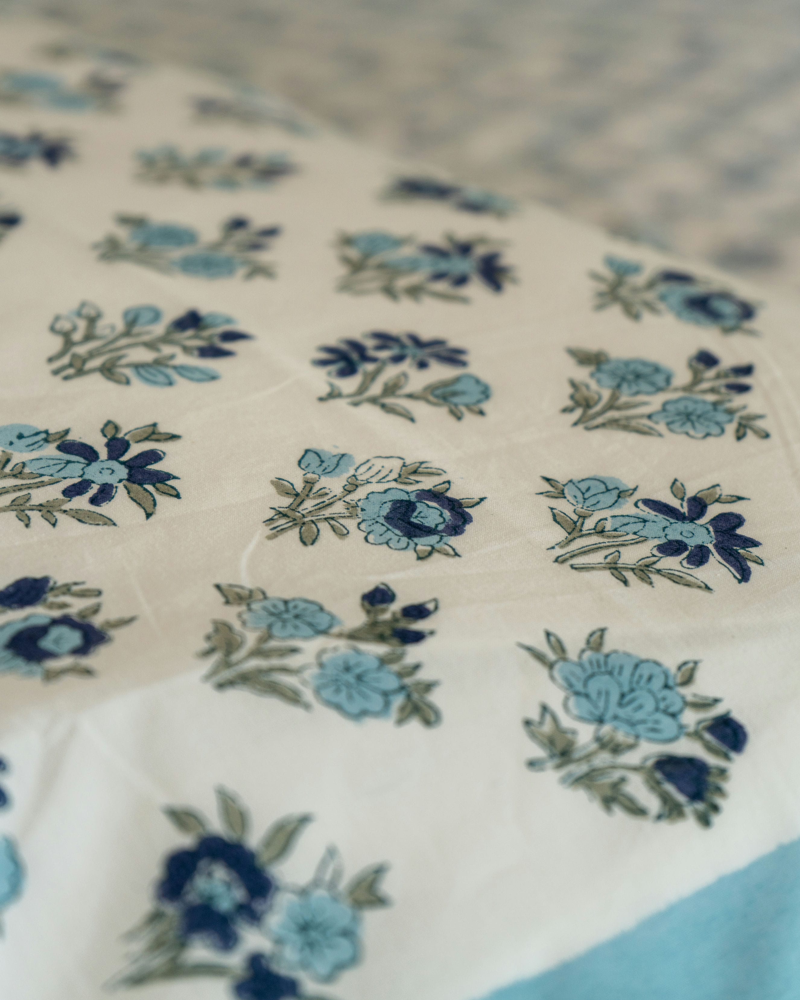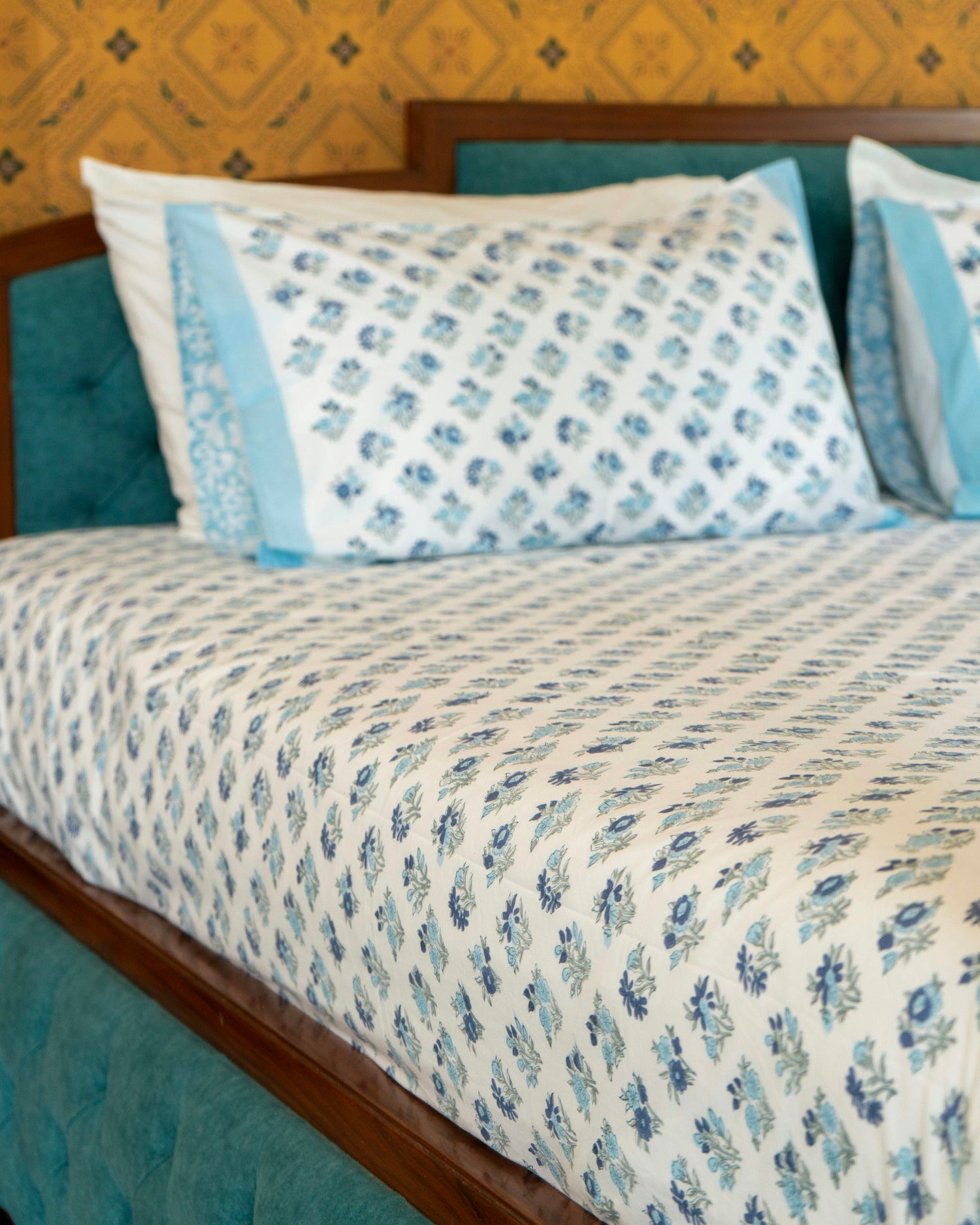 Celebrate the spirit of Diwali with The Mayura Blue, a hand block printed bed sheet set that’s a perfect blend of artistic craftsmanship and luxurious comfort. Inspired by the rich traditions of Jaipur, this set features intricate, hand-stamped floral patterns in soothing blue hues. The design evokes the elegance and beauty of a peacock’s plumage ('Mayura' in Sanskrit), adding a touch of serene sophistication to your bedroom.