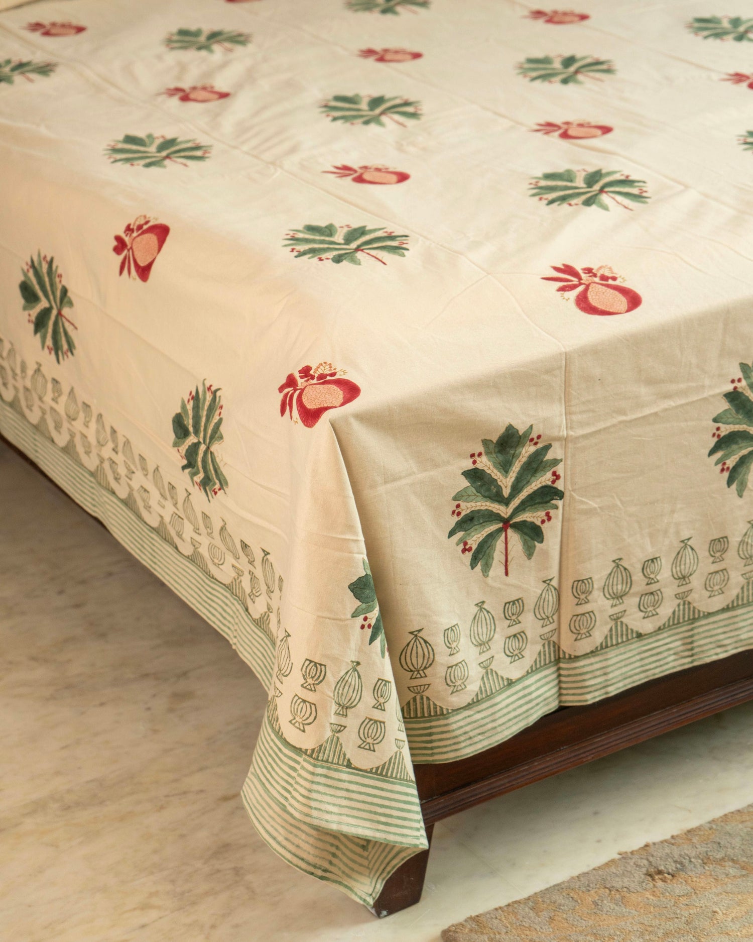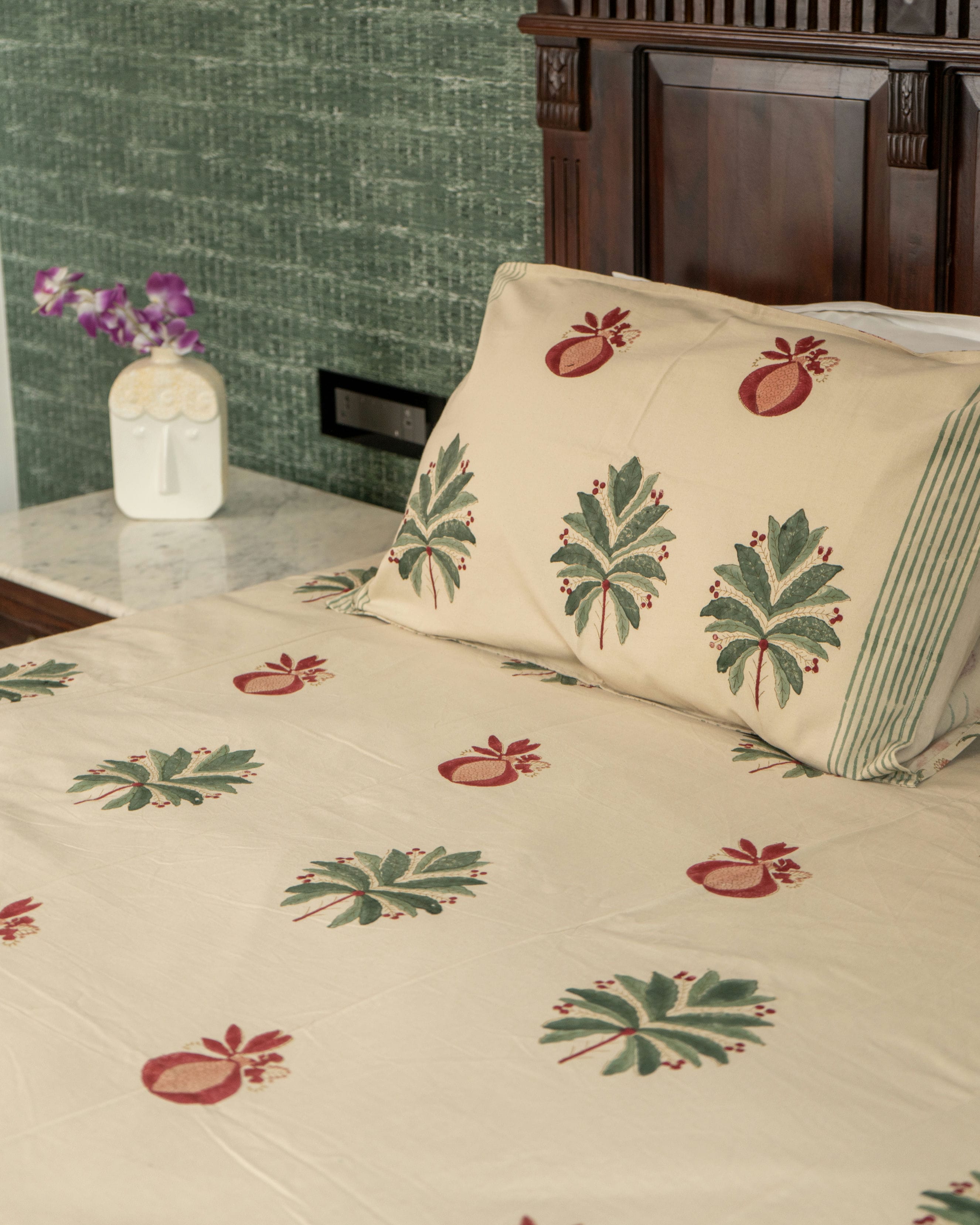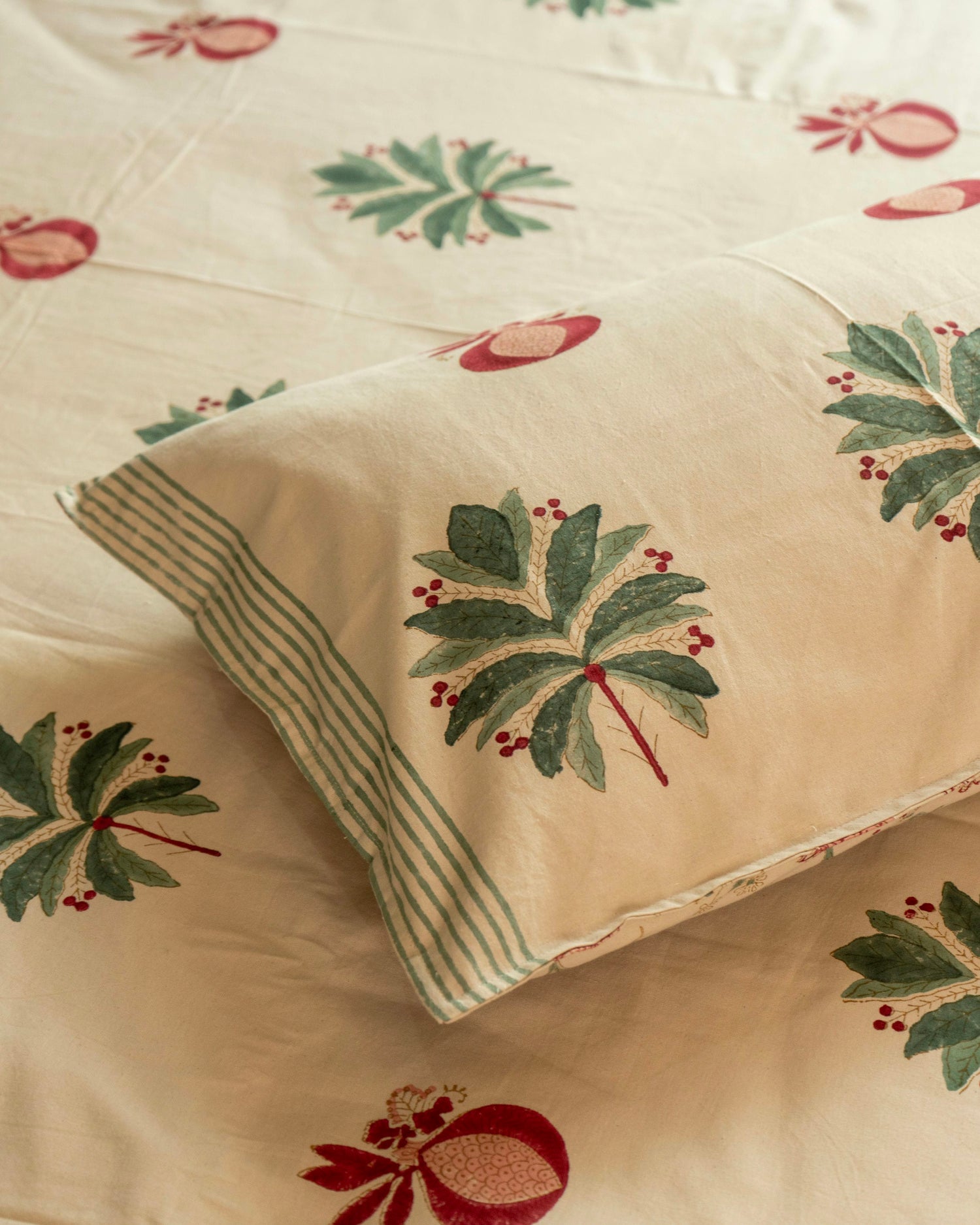 Bring the lush vibrancy of nature indoors with The Vanaspati Set. Named after the Hindi word for 'vegetation' or 'flora', this hand block printed bed sheet set features bold, stylized foliage and fruit motifs in a rich palette of deep green and festive maroon against a warm beige background. This traditional, striking design celebrates the abundance of the Indian garden.