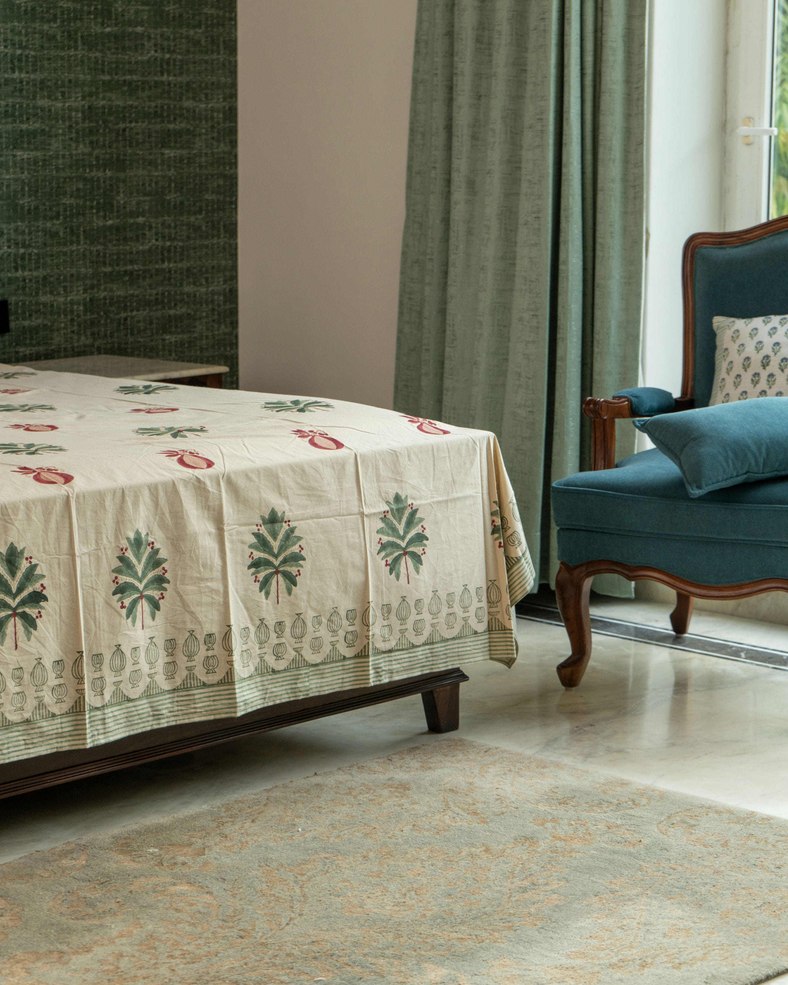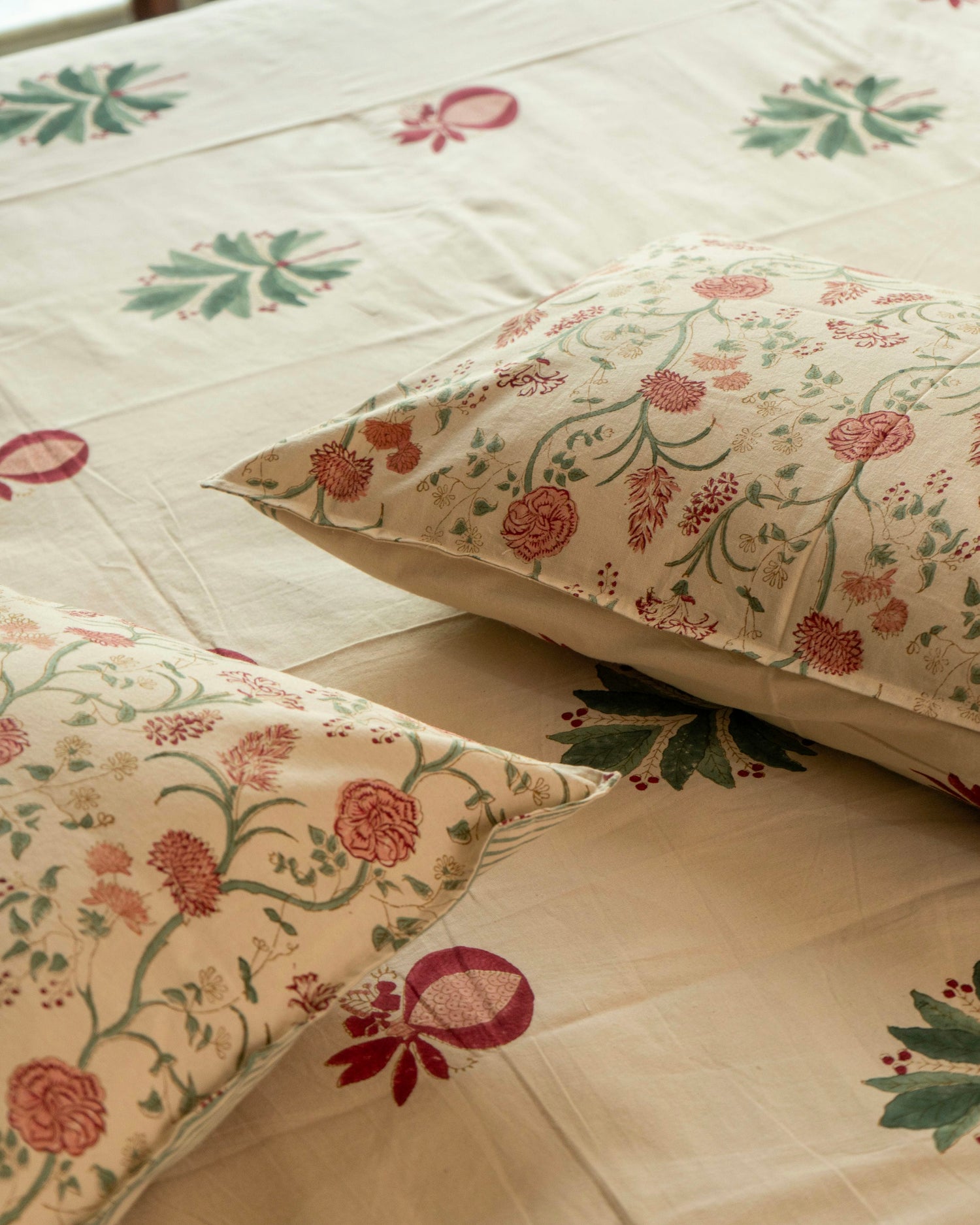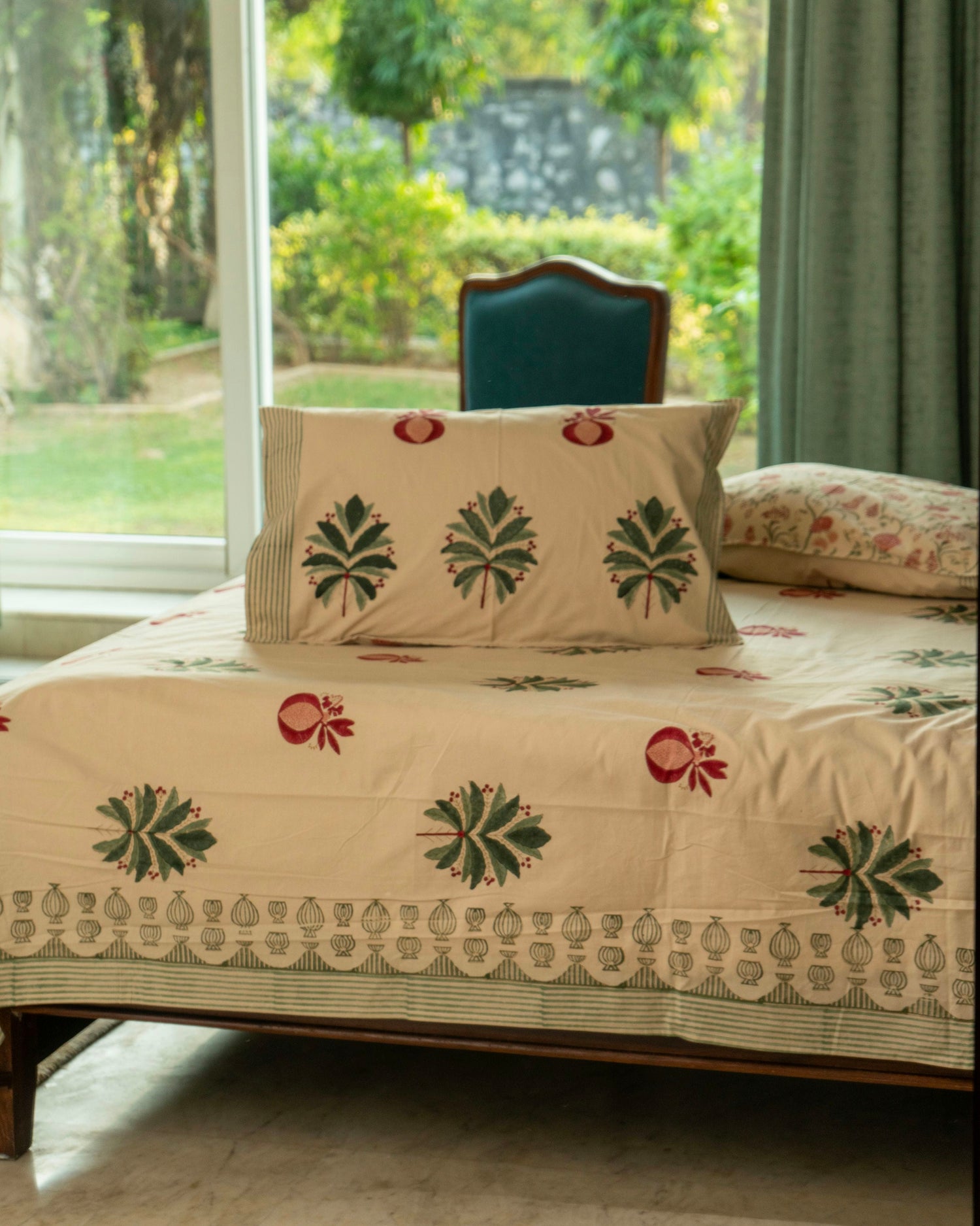 Bring the lush vibrancy of nature indoors with The Vanaspati Set. Named after the Hindi word for 'vegetation' or 'flora', this hand block printed bed sheet set features bold, stylized foliage and fruit motifs in a rich palette of deep green and festive maroon against a warm beige background. This traditional, striking design celebrates the abundance of the Indian garden.
