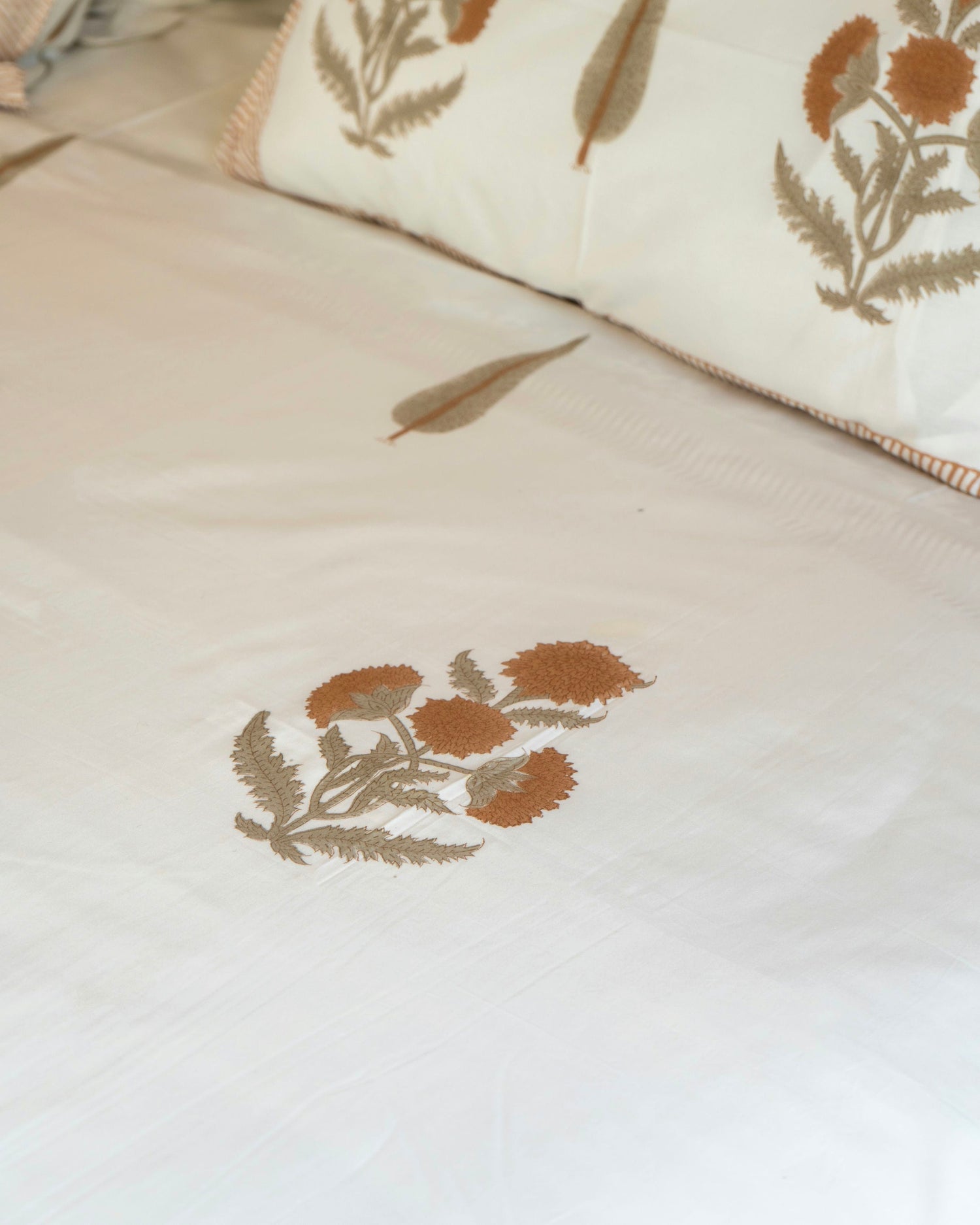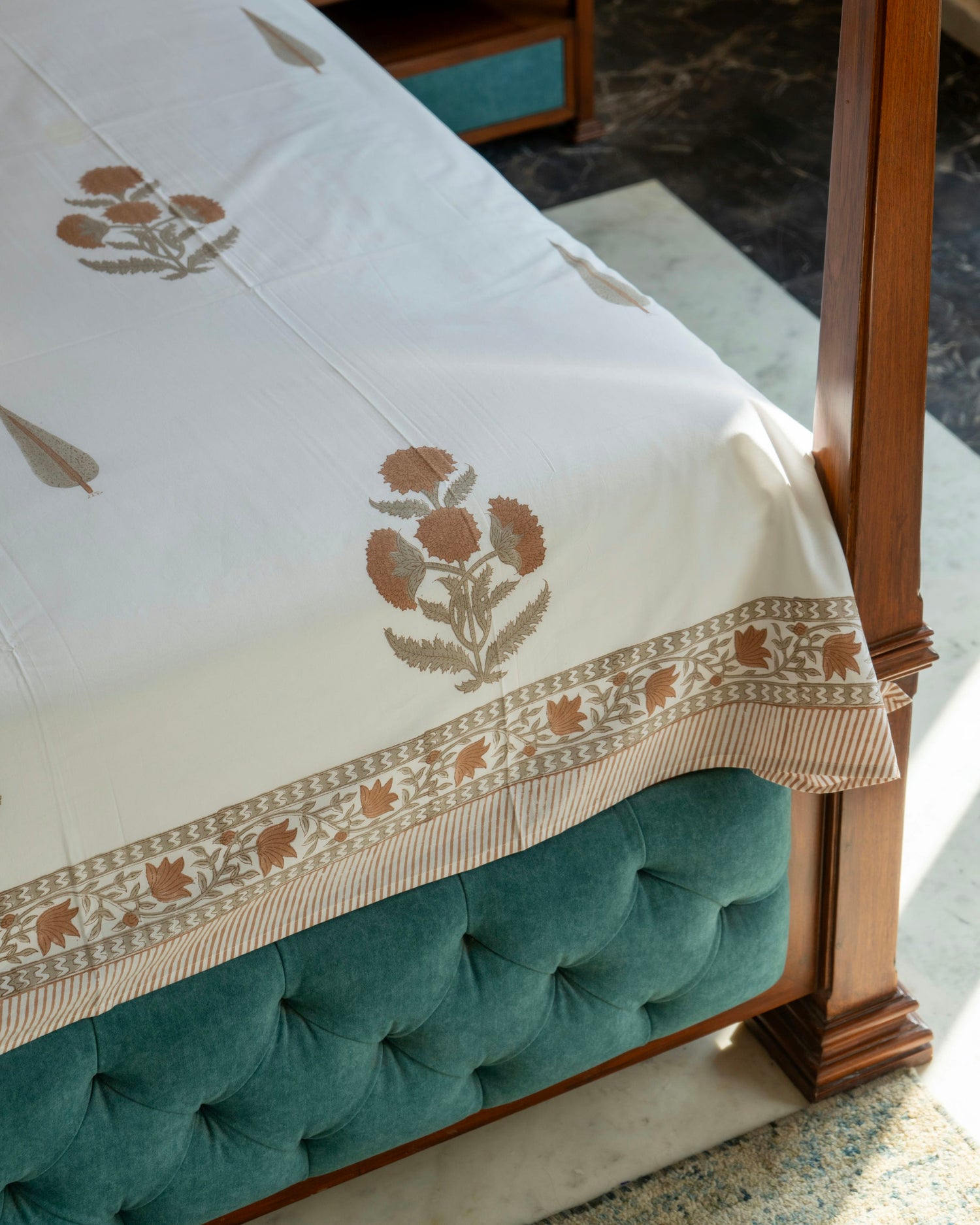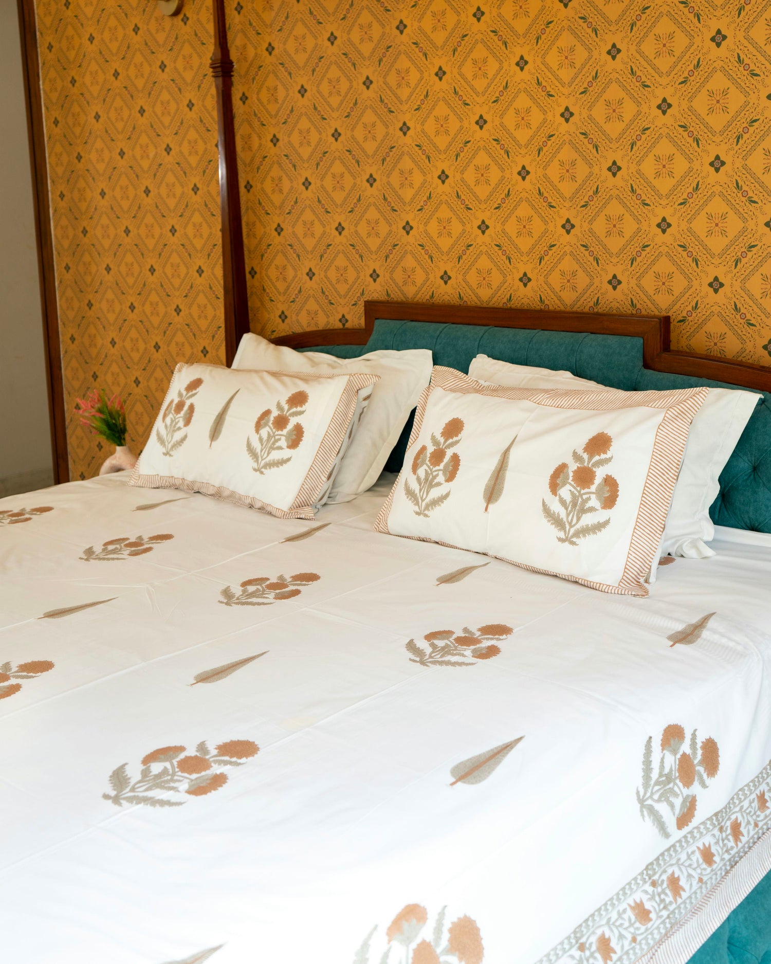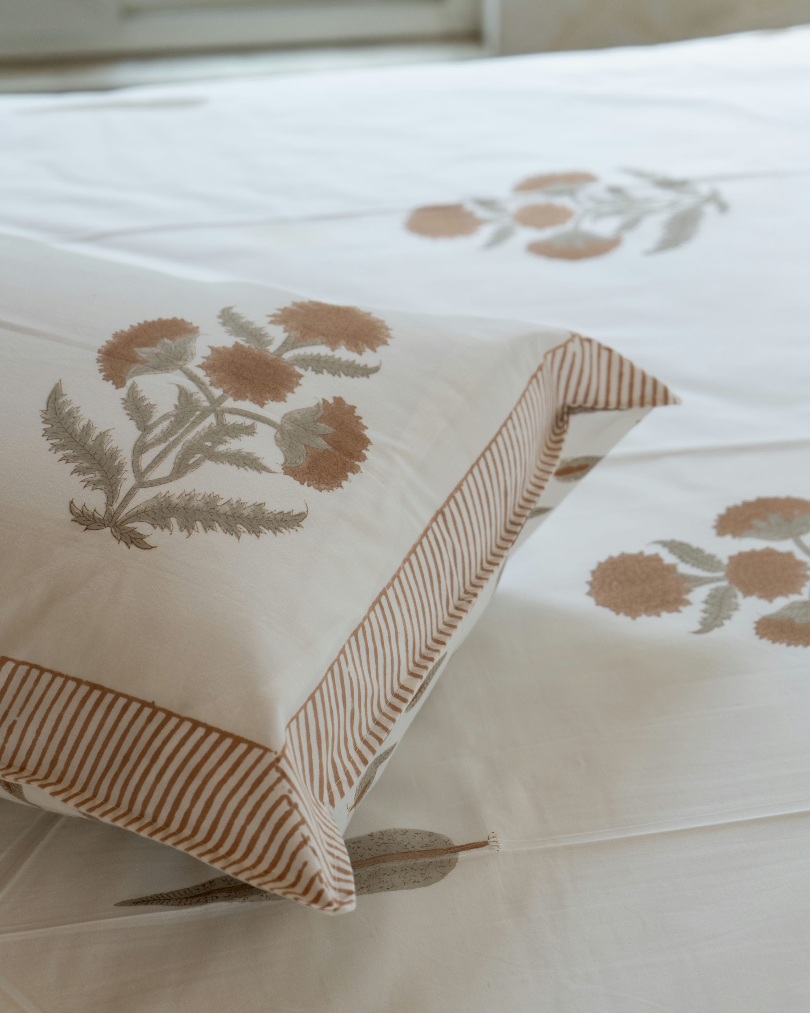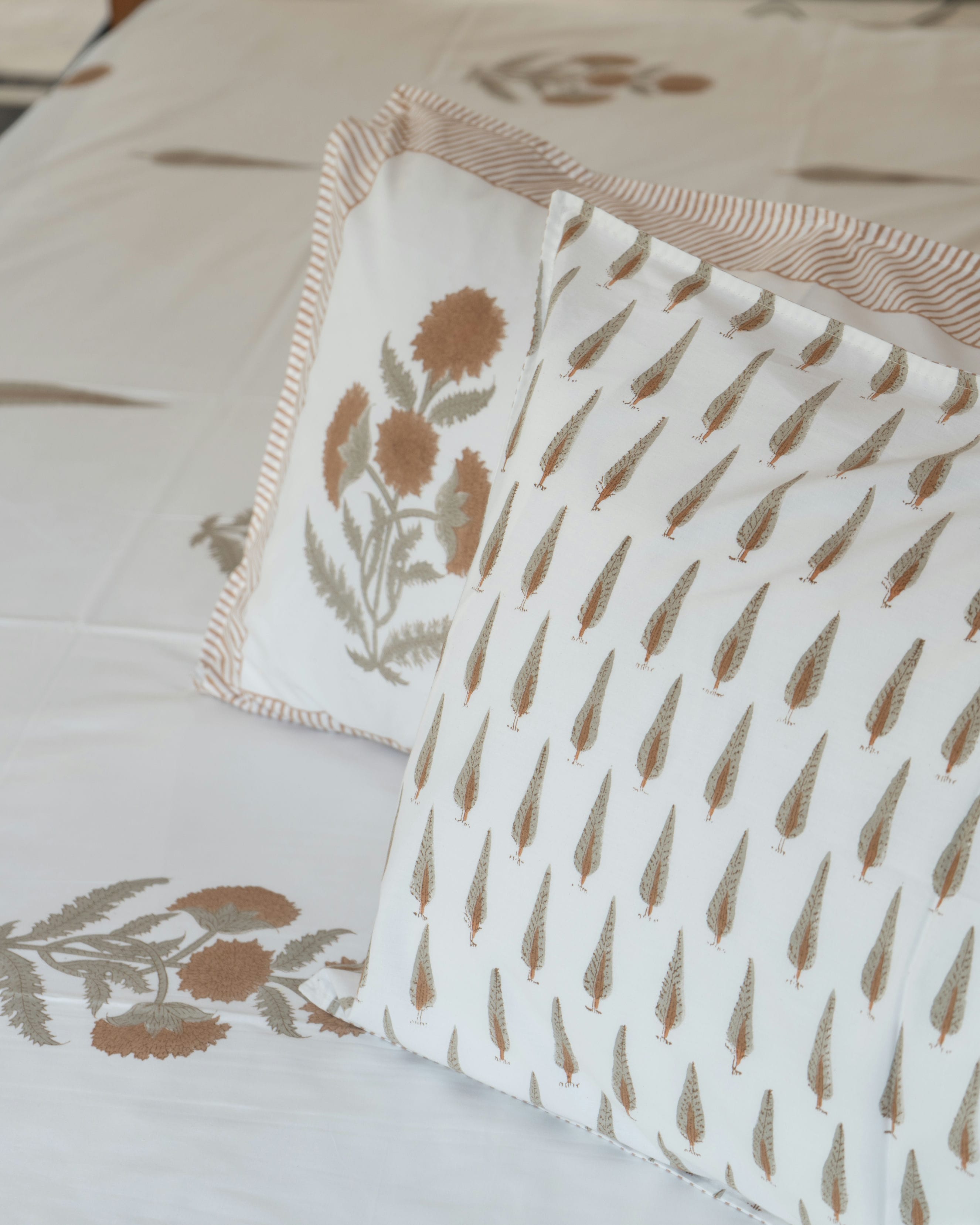 Welcome the gentle warmth of spring into your home with The Vasant Set. Named after the Sanskrit word for spring, this hand block printed bed sheet set features elegant floral and feather motifs in a serene earthy palette of soft brown and beige. The design is inspired by nature's subtle beauty, creating a sophisticated and calming retreat in your bedroom.