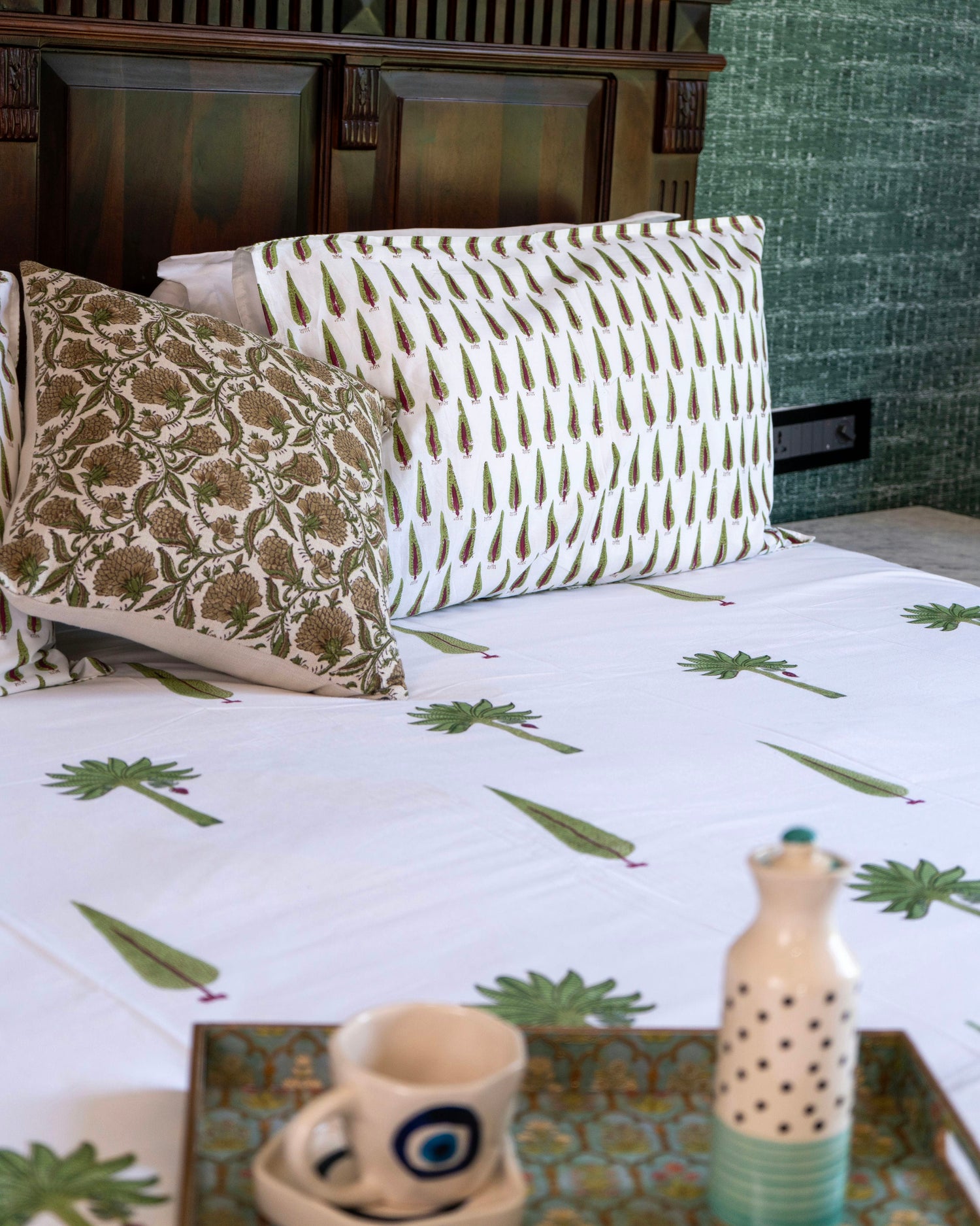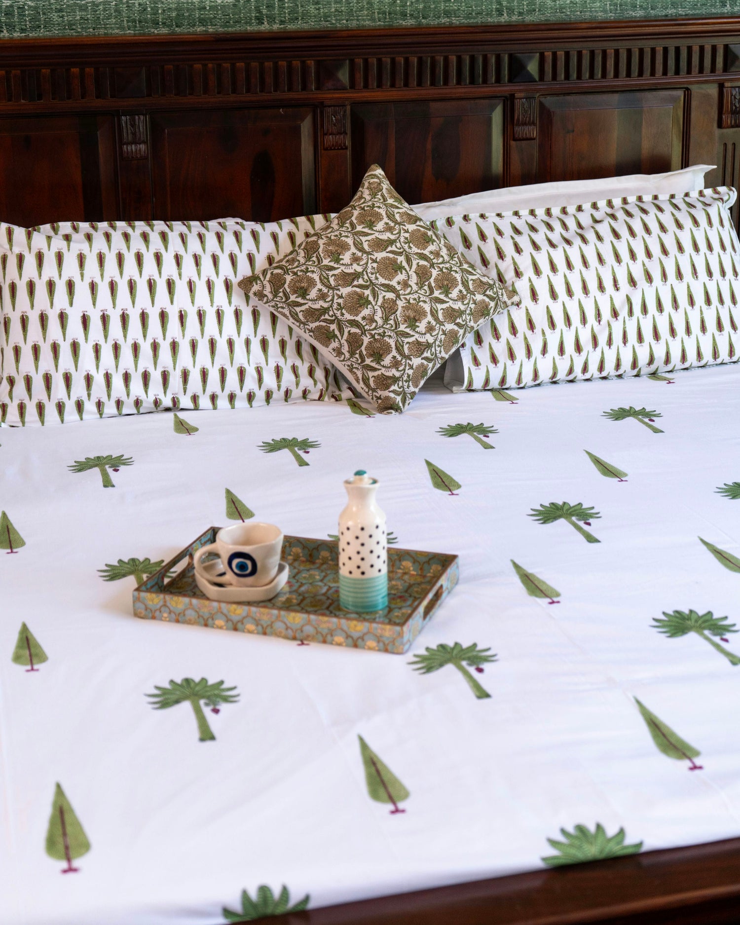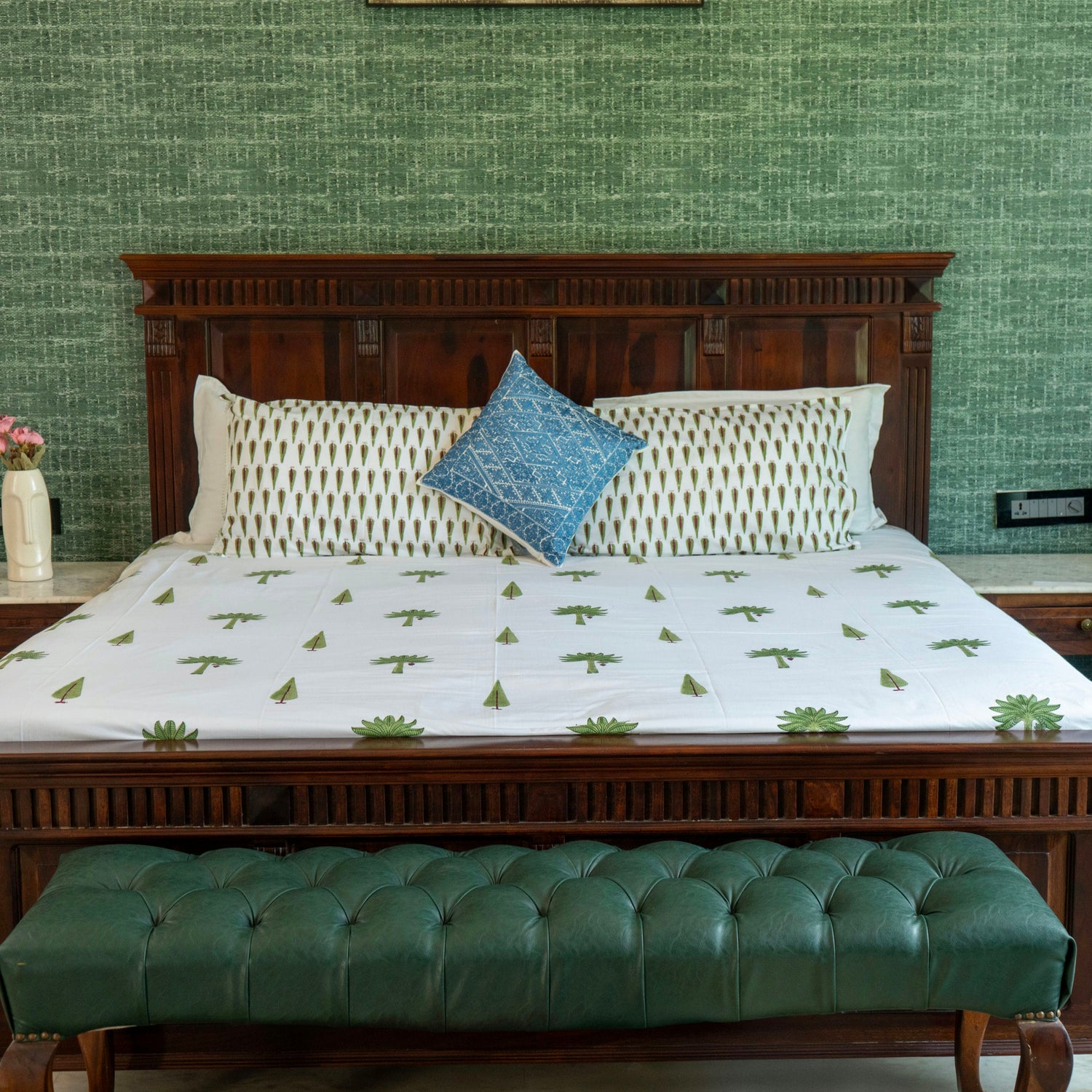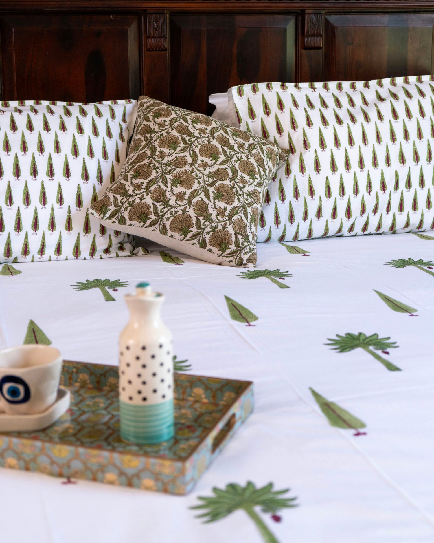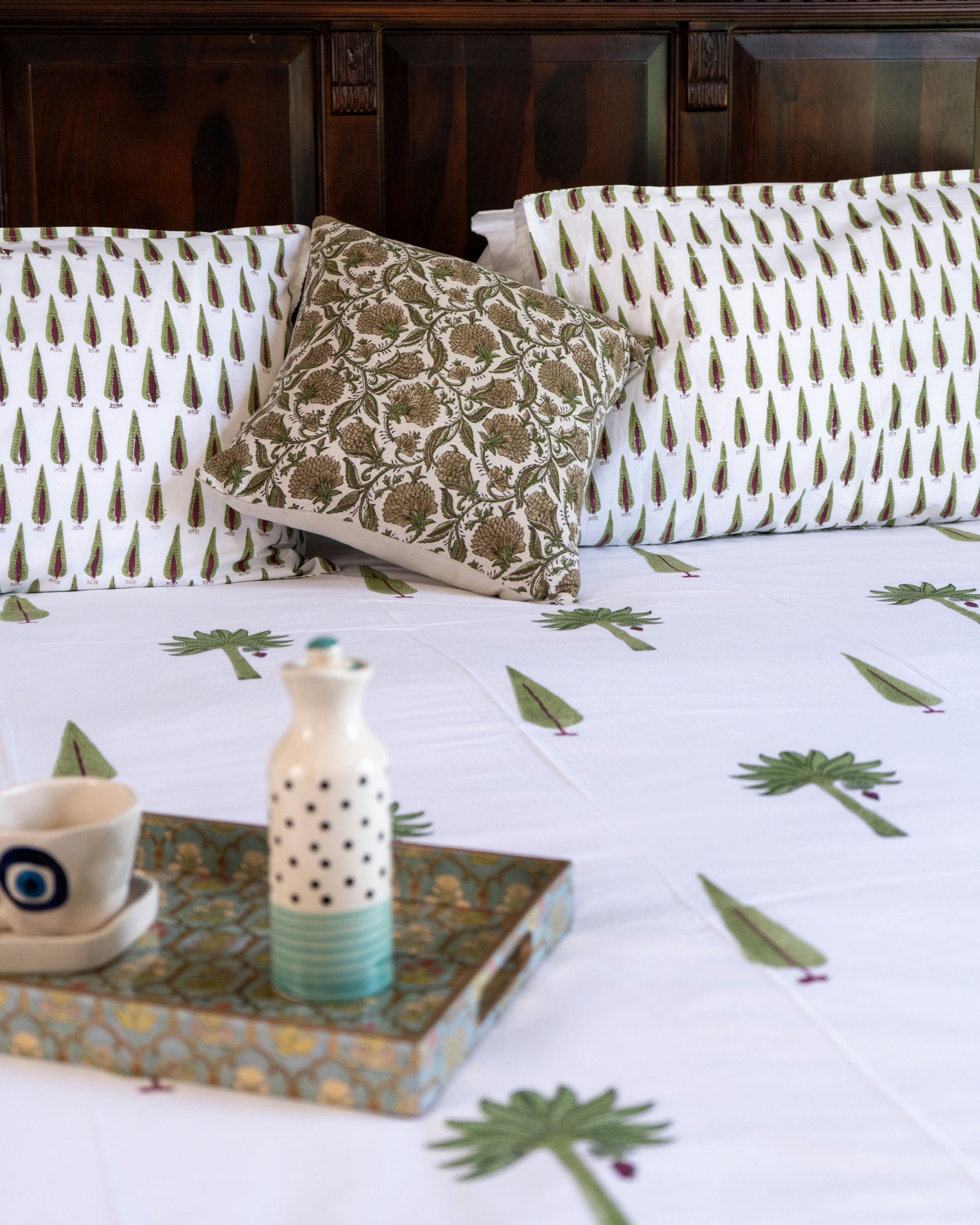 Bring the tranquil essence of a forest grove into your bedroom with The Vrinda Set. Named after the Hindi word for a small forest or grove, this hand block printed bed sheet set features delicate motifs of trees and leaves in a soothing palette of blues and greens. Each pattern is meticulously hand-stamped by skilled artisans from Jaipur, celebrating the timeless artistry of Indian block printing.