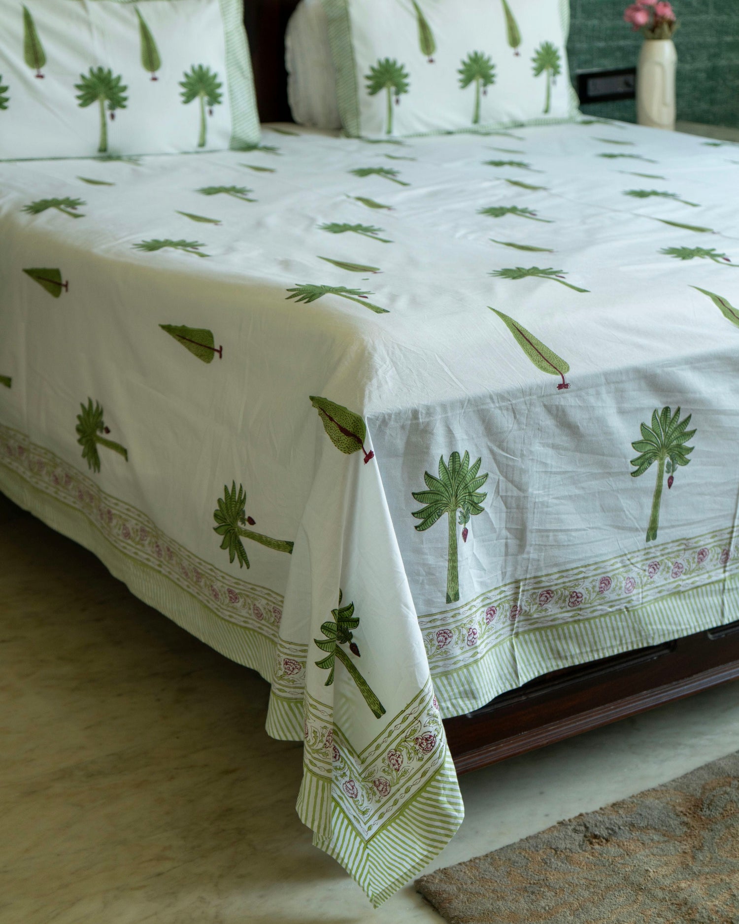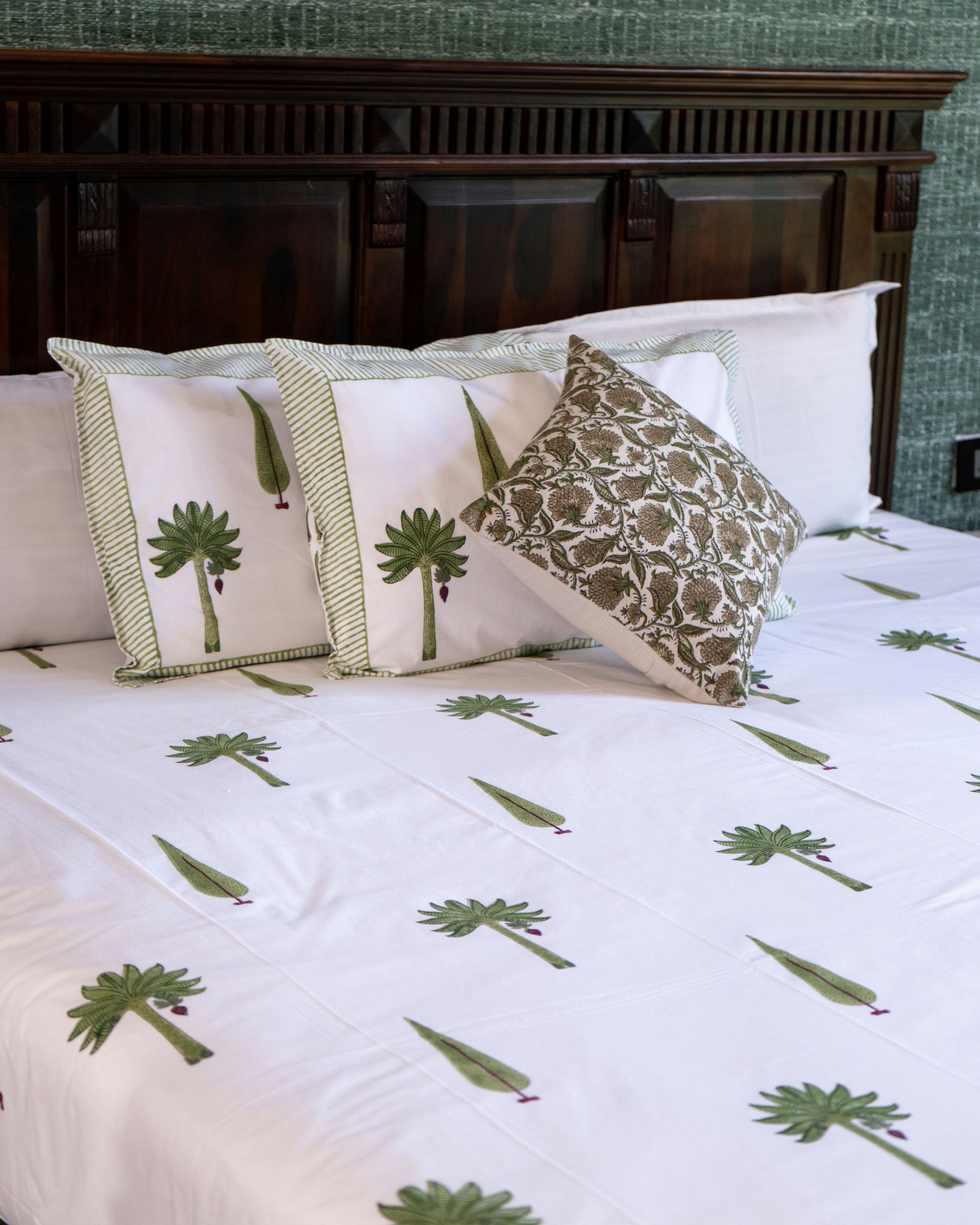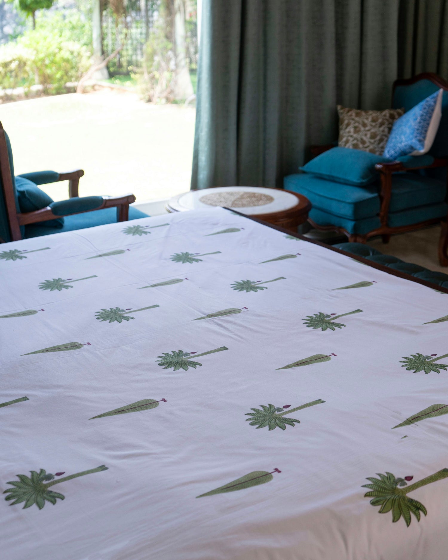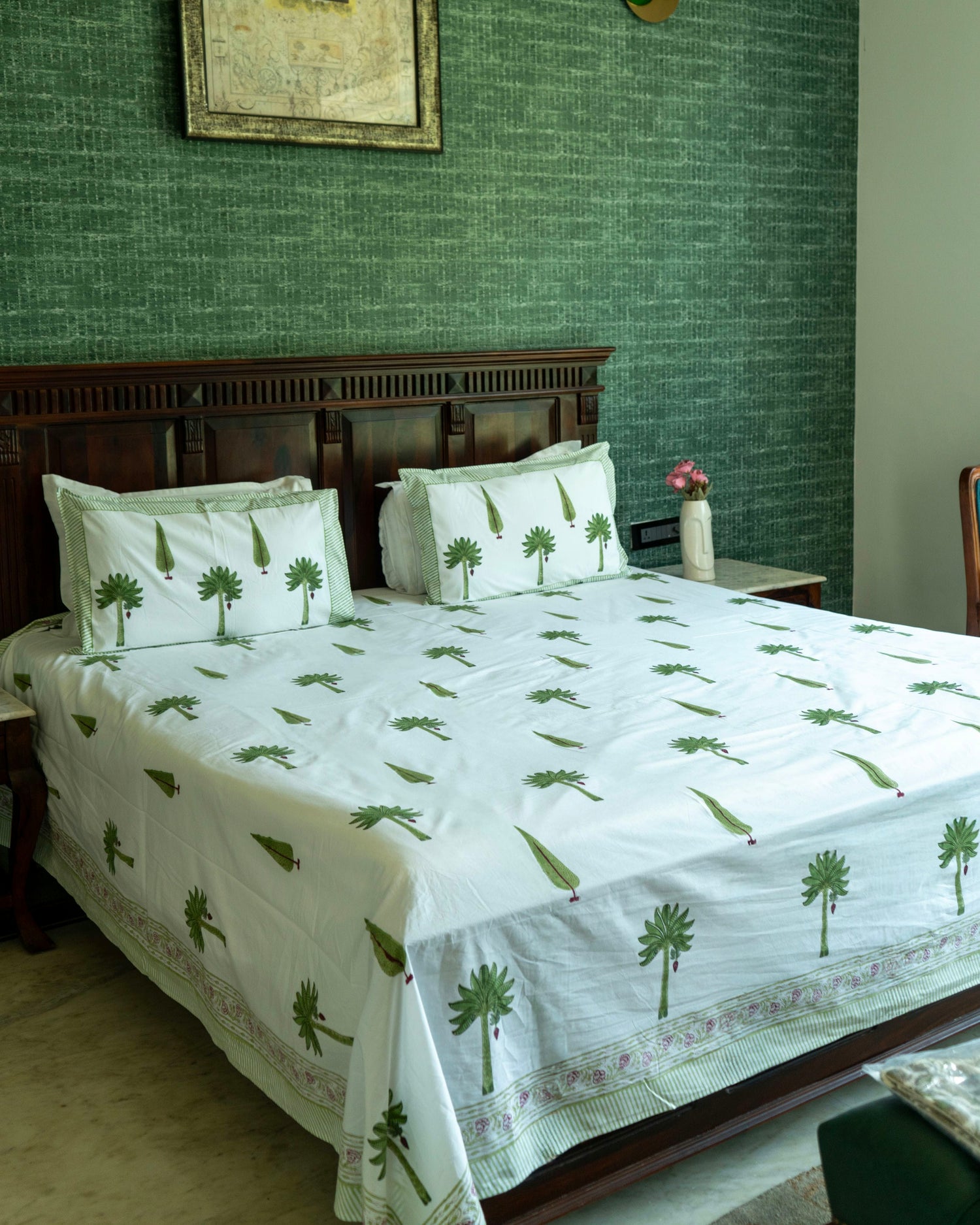 Bring the tranquil essence of a forest grove into your bedroom with The Vrinda Set. Named after the Hindi word for a small forest or grove, this hand block printed bed sheet set features delicate motifs of trees and leaves in a soothing palette of blues and greens. Each pattern is meticulously hand-stamped by skilled artisans from Jaipur, celebrating the timeless artistry of Indian block printing.