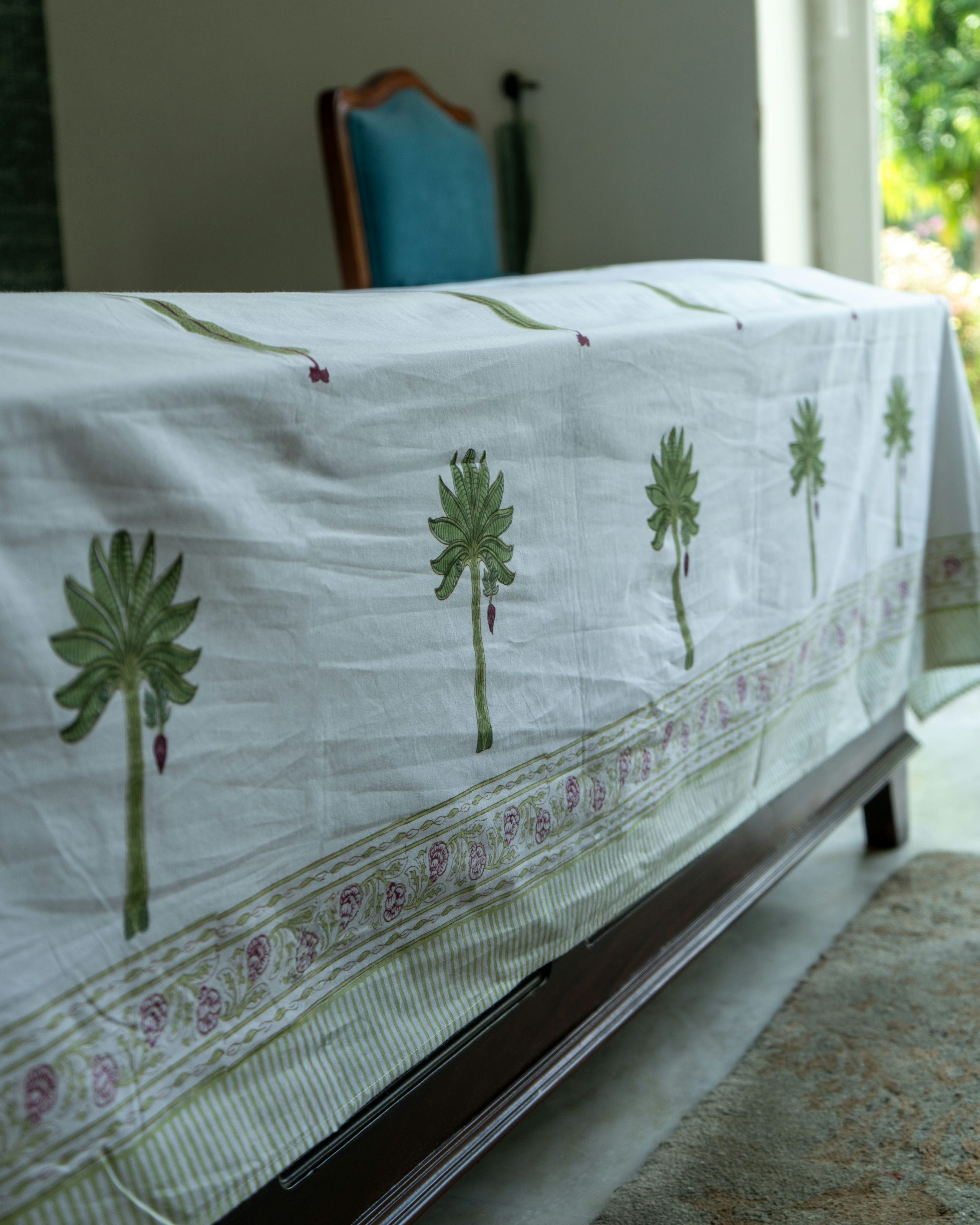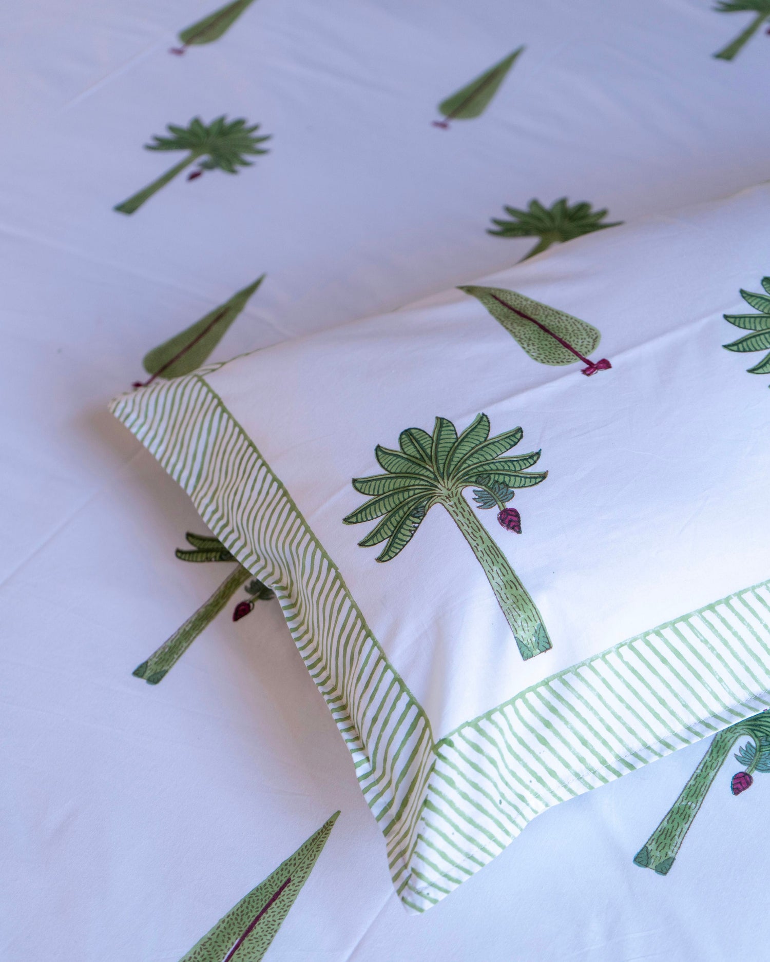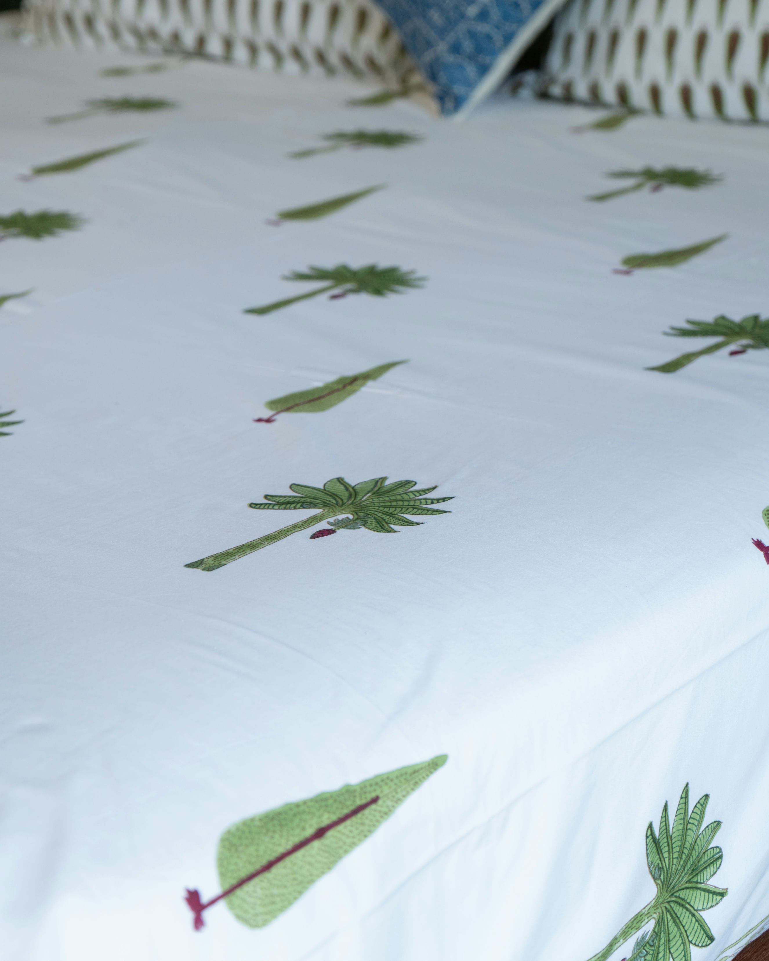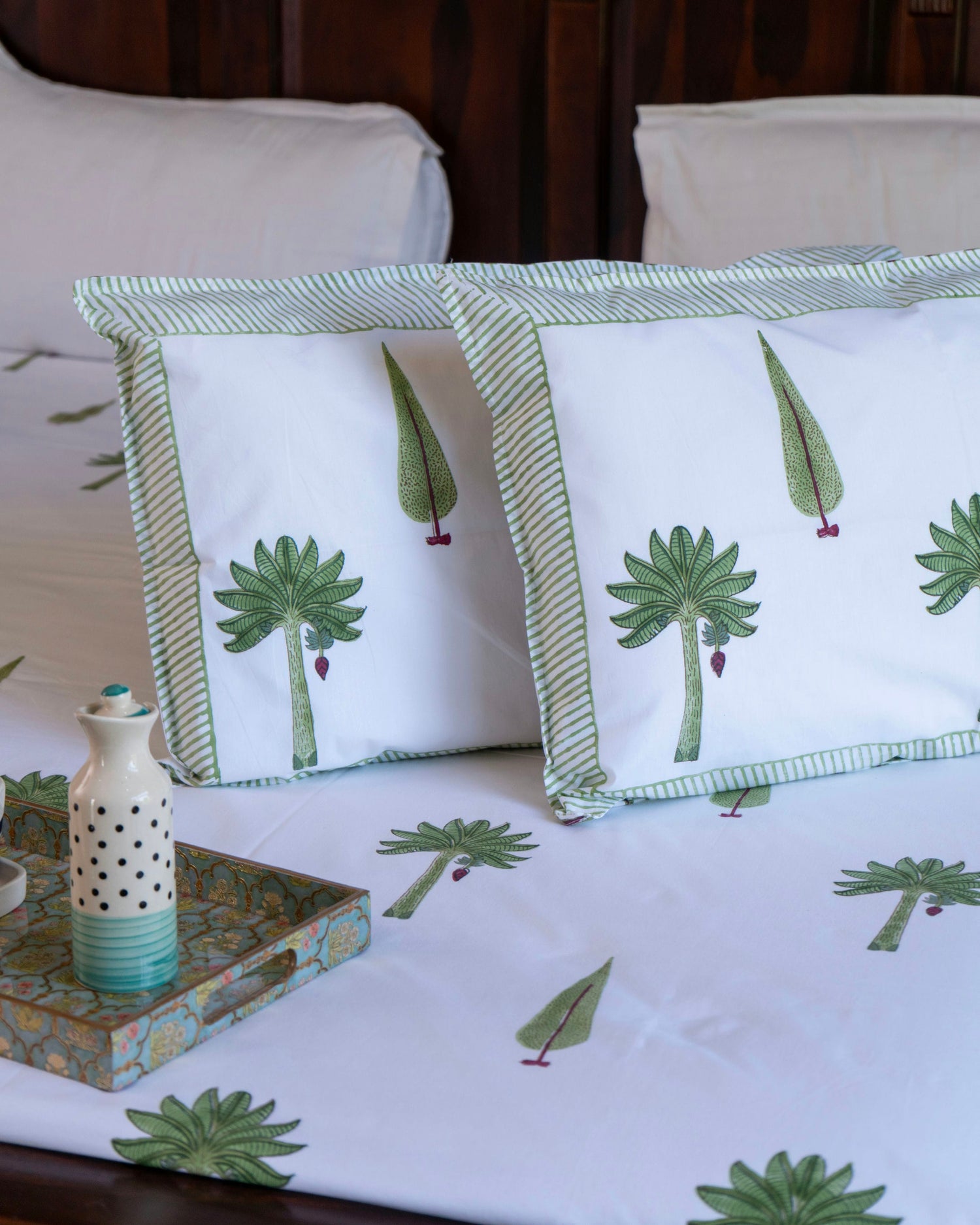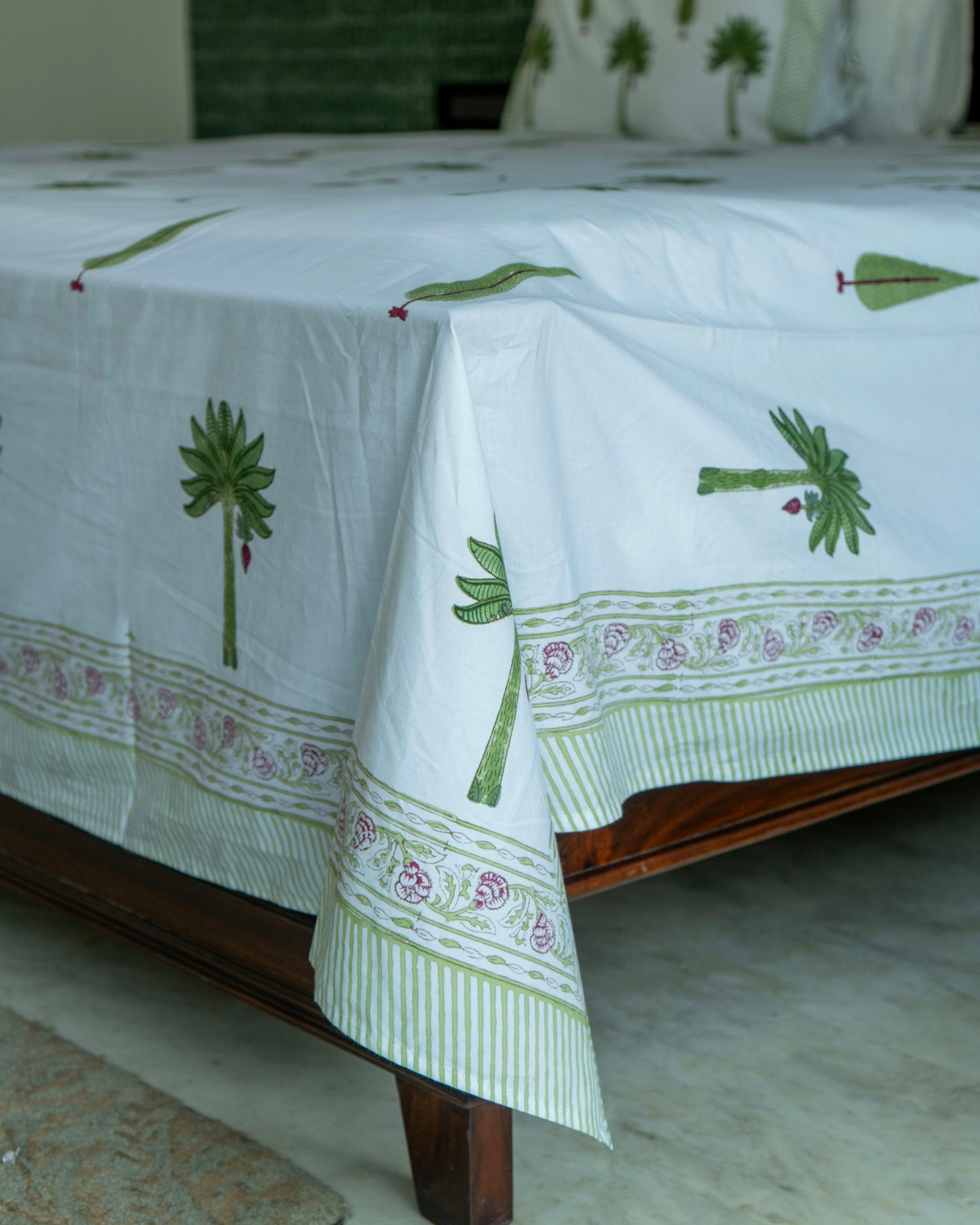 Bring the tranquil essence of a forest grove into your bedroom with The Vrinda Set. Named after the Hindi word for a small forest or grove, this hand block printed bed sheet set features delicate motifs of trees and leaves in a soothing palette of blues and greens. Each pattern is meticulously hand-stamped by skilled artisans from Jaipur, celebrating the timeless artistry of Indian block printing.